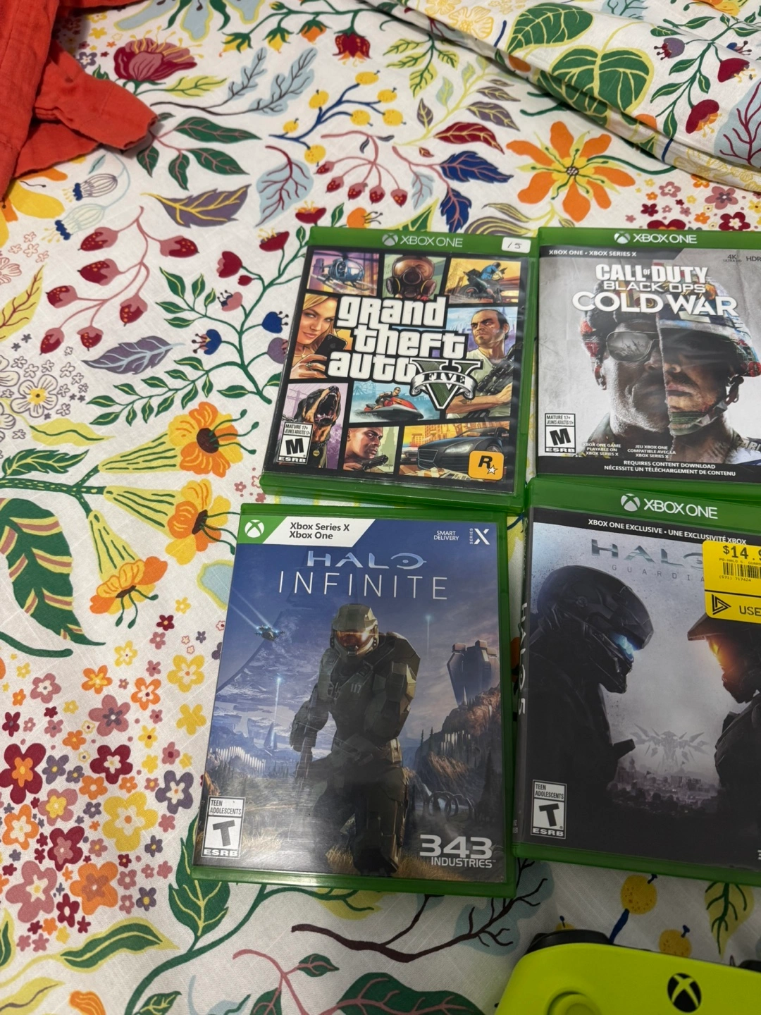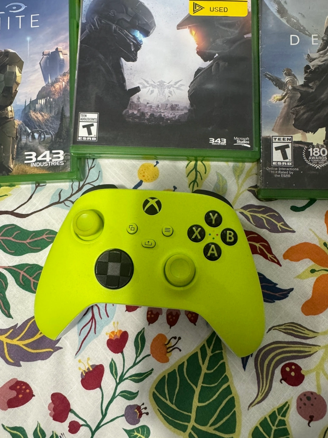 A collection of video games and a controller for the Xbox console. The controller is neon green in colour. GTA -$20