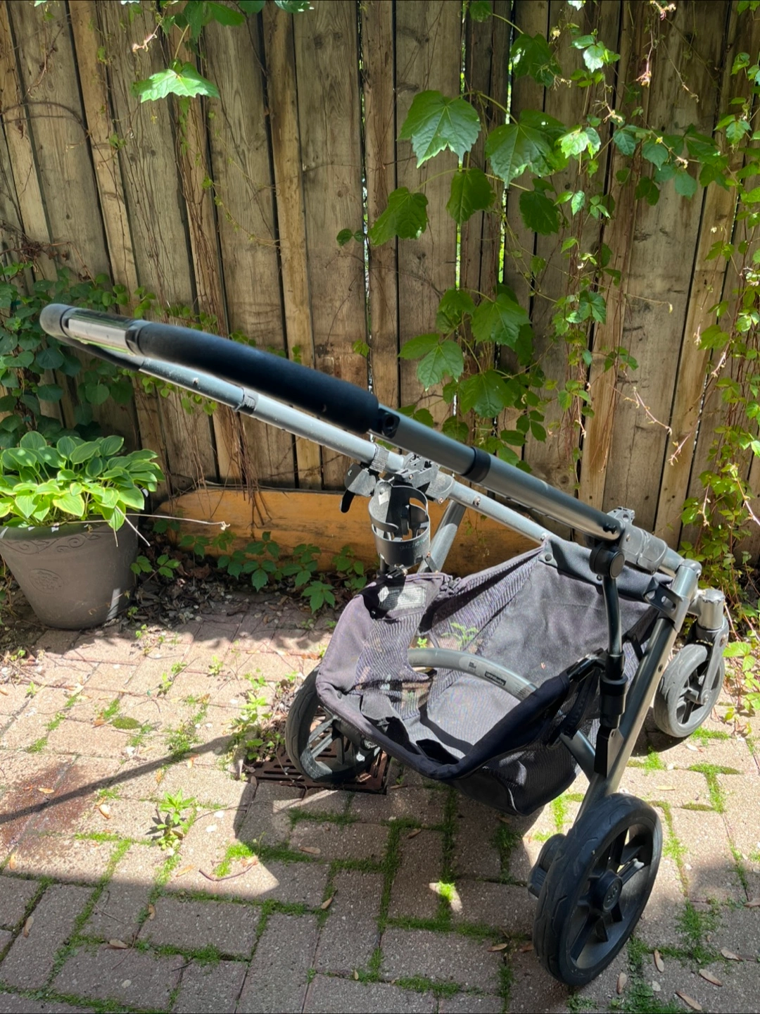 -stroller frame with large basket underneath for carrying bags