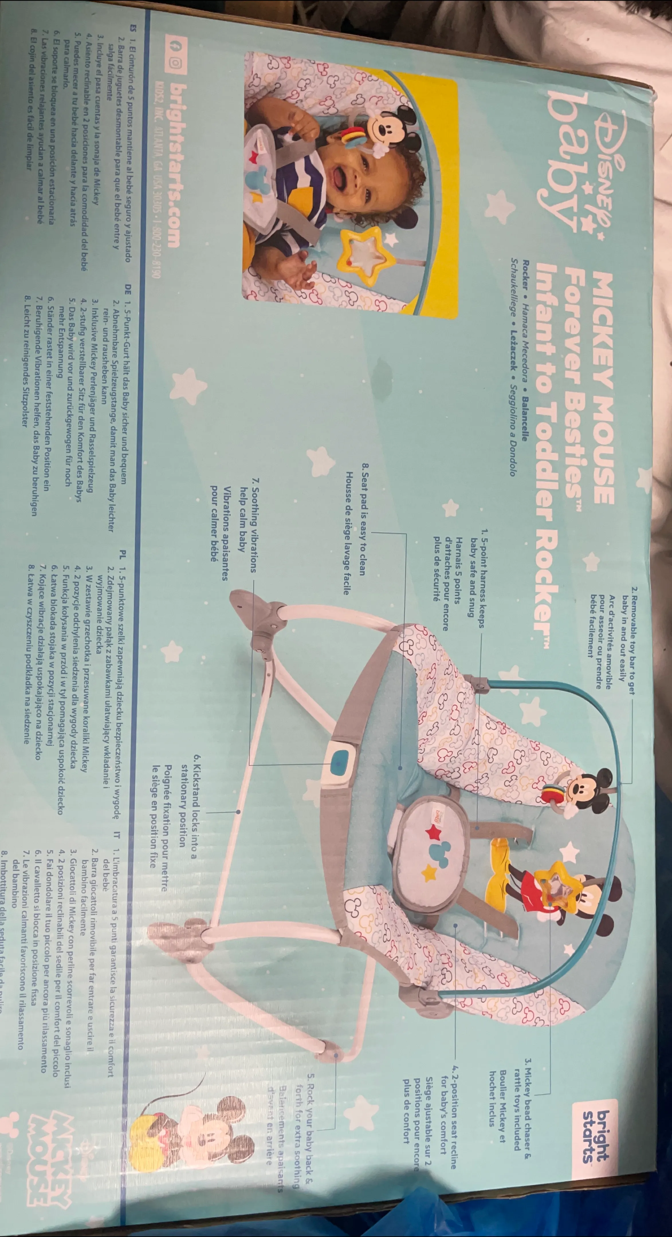 Features soothing vibrations to help calm your baby. Has a removable toy bar with Mickey toys, and a 2-position seat recline.