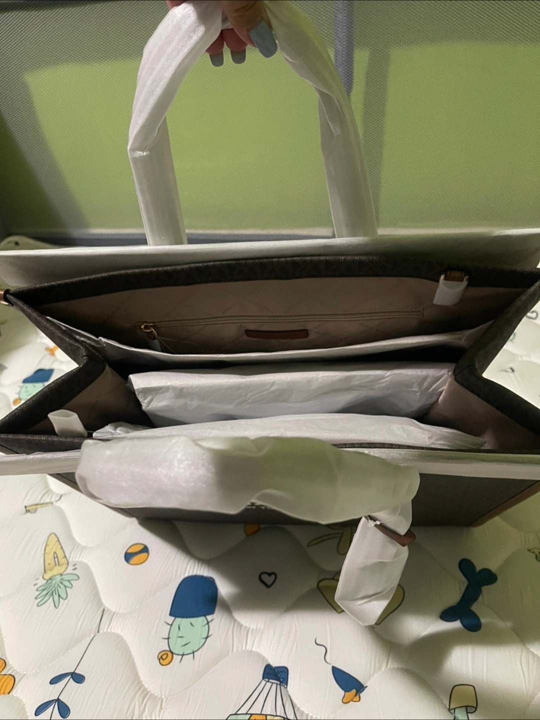Brown tote bag. Features two handles at the top. Signature logo pattern covers the entire body. Offers a roomy interior. A great bag to enjoy, whatever your day calls for.
