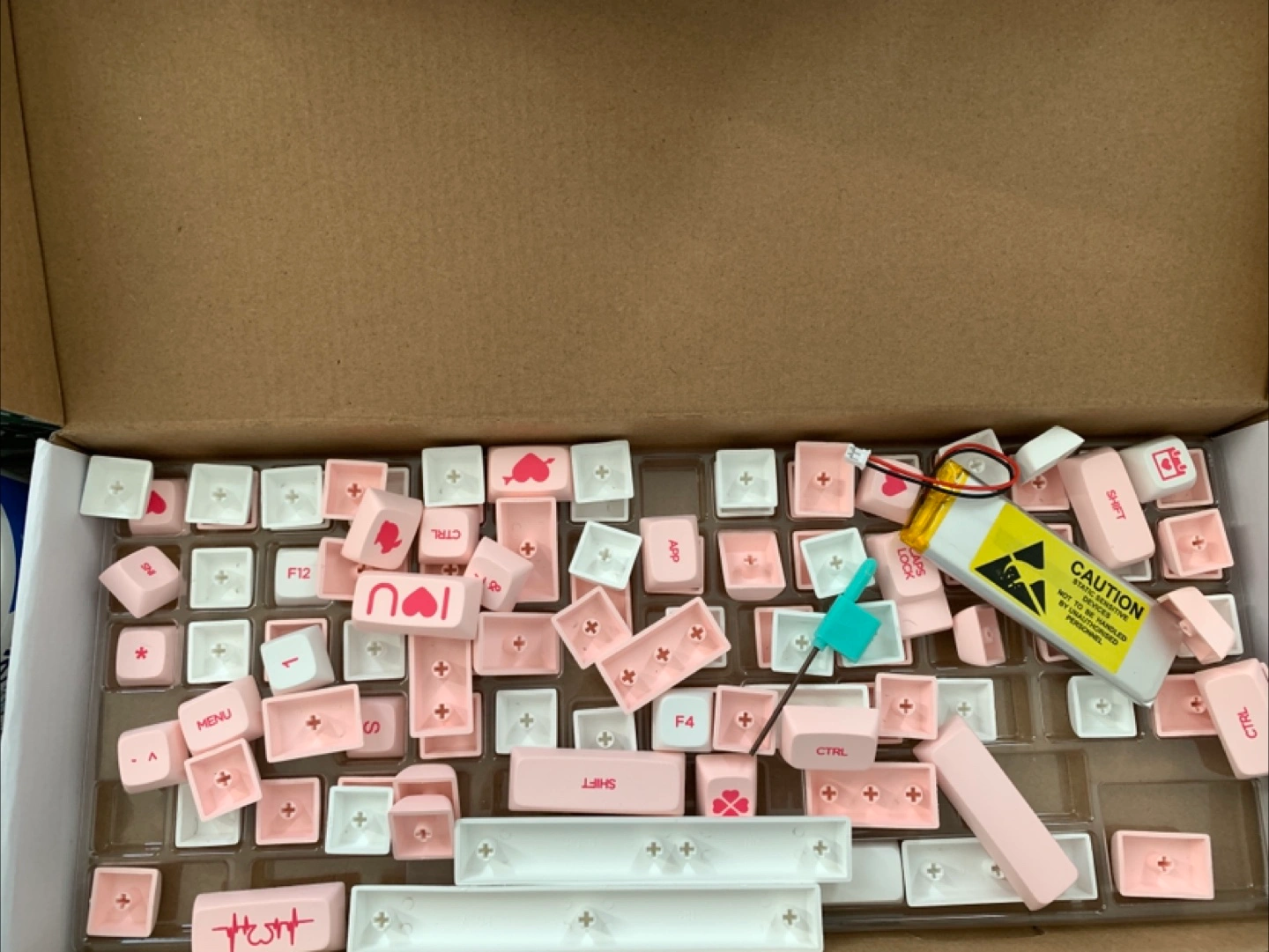 A set of keyboard keycaps, unmounted, inside a box. The keycaps appear to be pink and white. They include the word "I love you" on a key. Typing on these will bring a calm atmosphere.