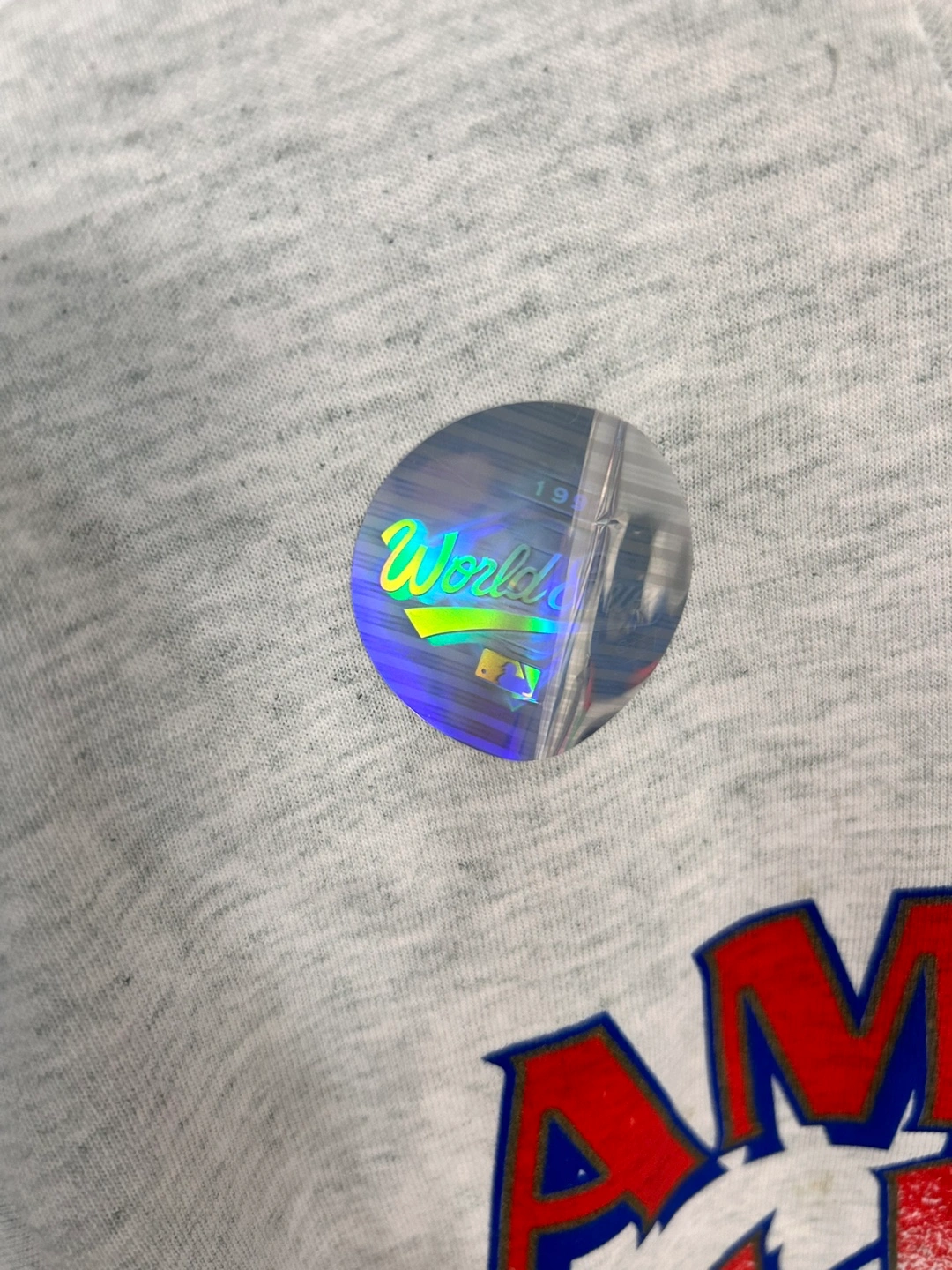 An amazing grey t-shirt, a true vintage find. Features large colorful graphics on the front and back. Made of a soft, likely pre-shrunk material, perfect for relaxing. A great shirt to show off your love for baseball.