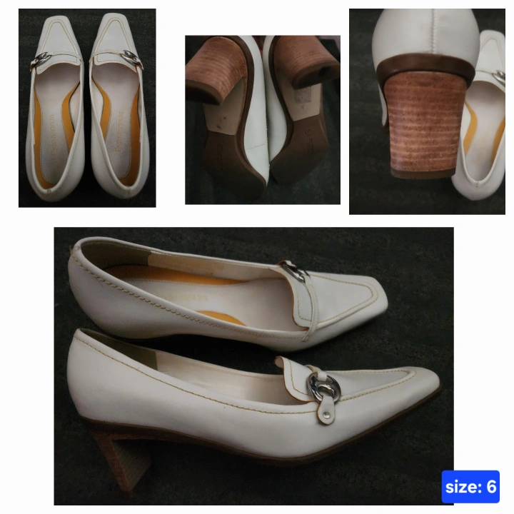 White leather loafers with a square toe. A metal buckle detail. The heels have a wooden appearance.