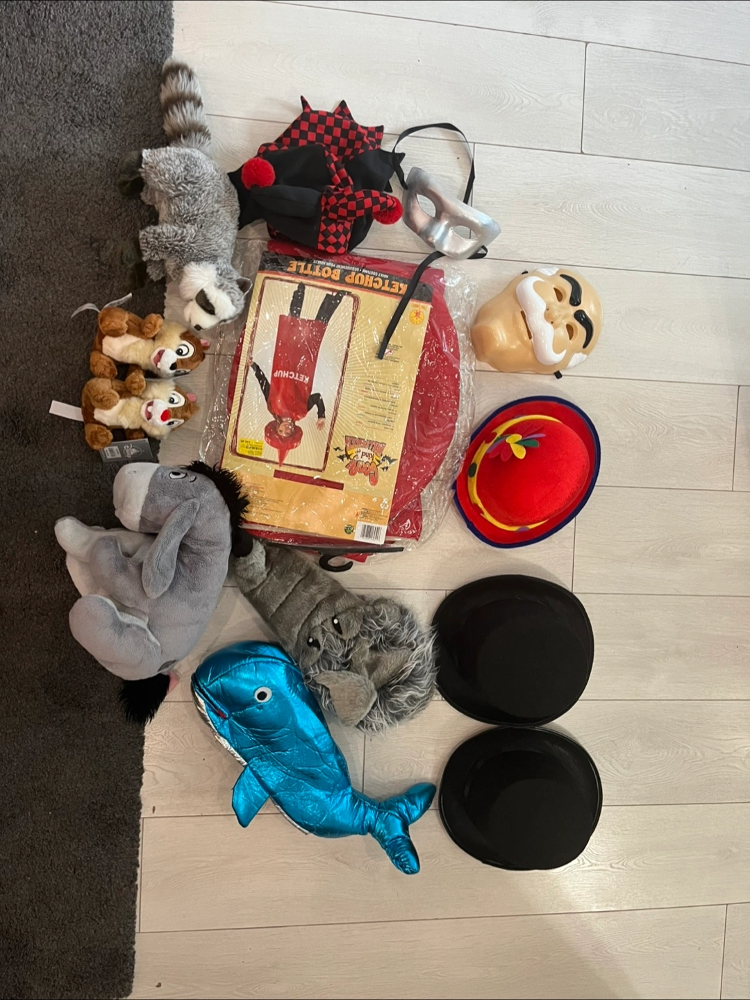 44Tennis racket (one left)- 5 each Photo frames - 3 each Body scale - 20 Jump car cable - 10 Whale or wolf hats - 5 each Hot dog costume - 20 Hats - 5 each