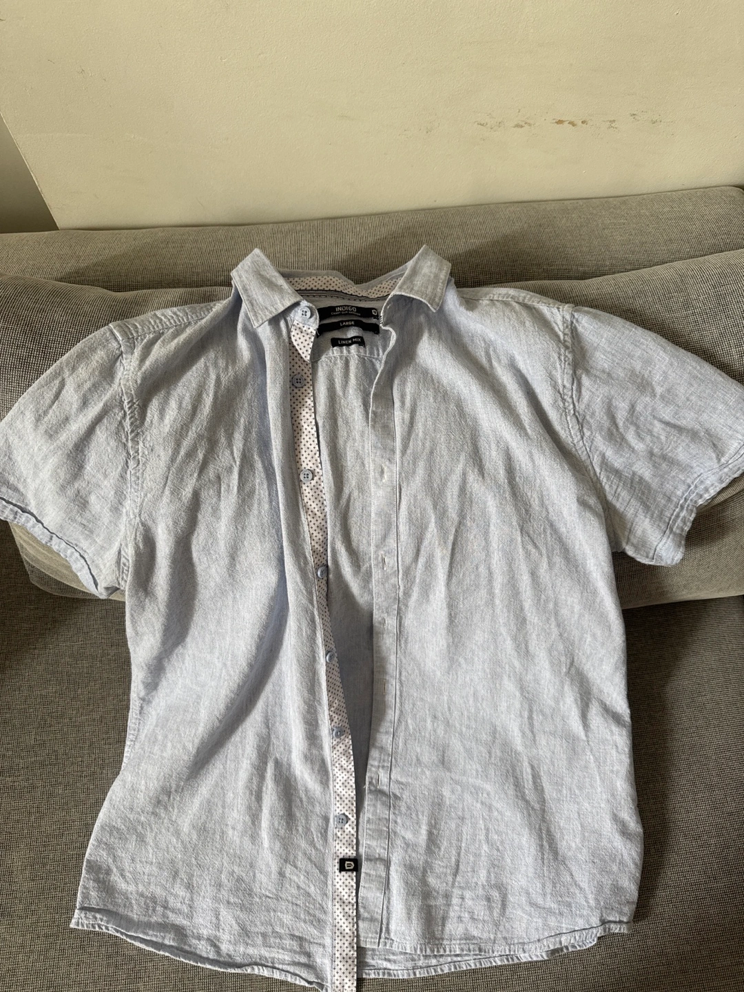 Light blue short sleeve button-up shirt. Features a collar and buttoned front. Made from a linen mix material. This shirt can be perfect for a relaxed day out.