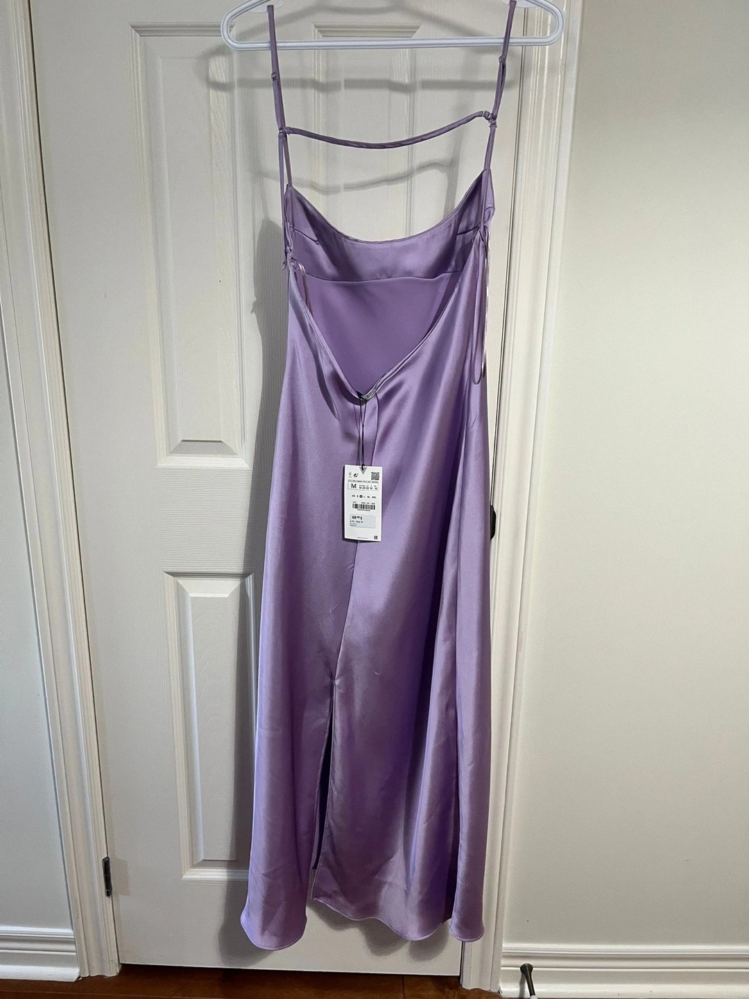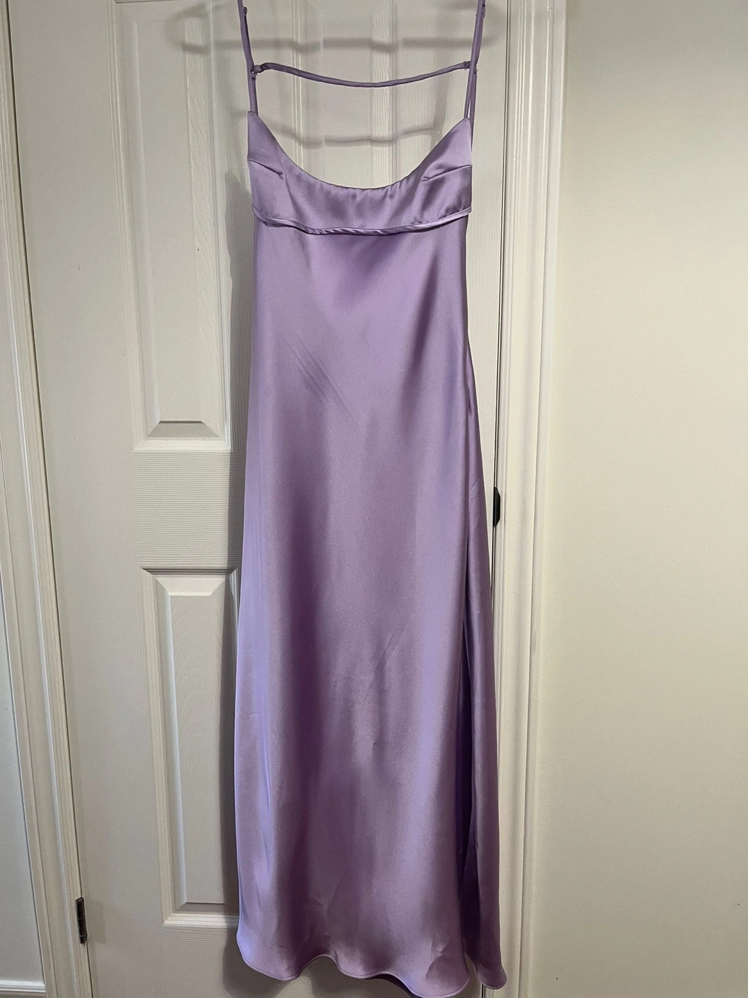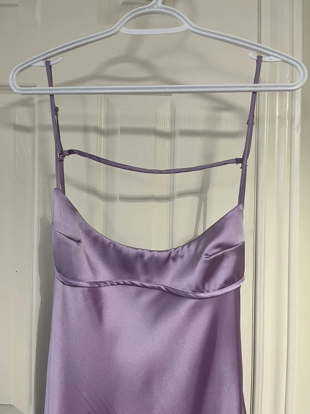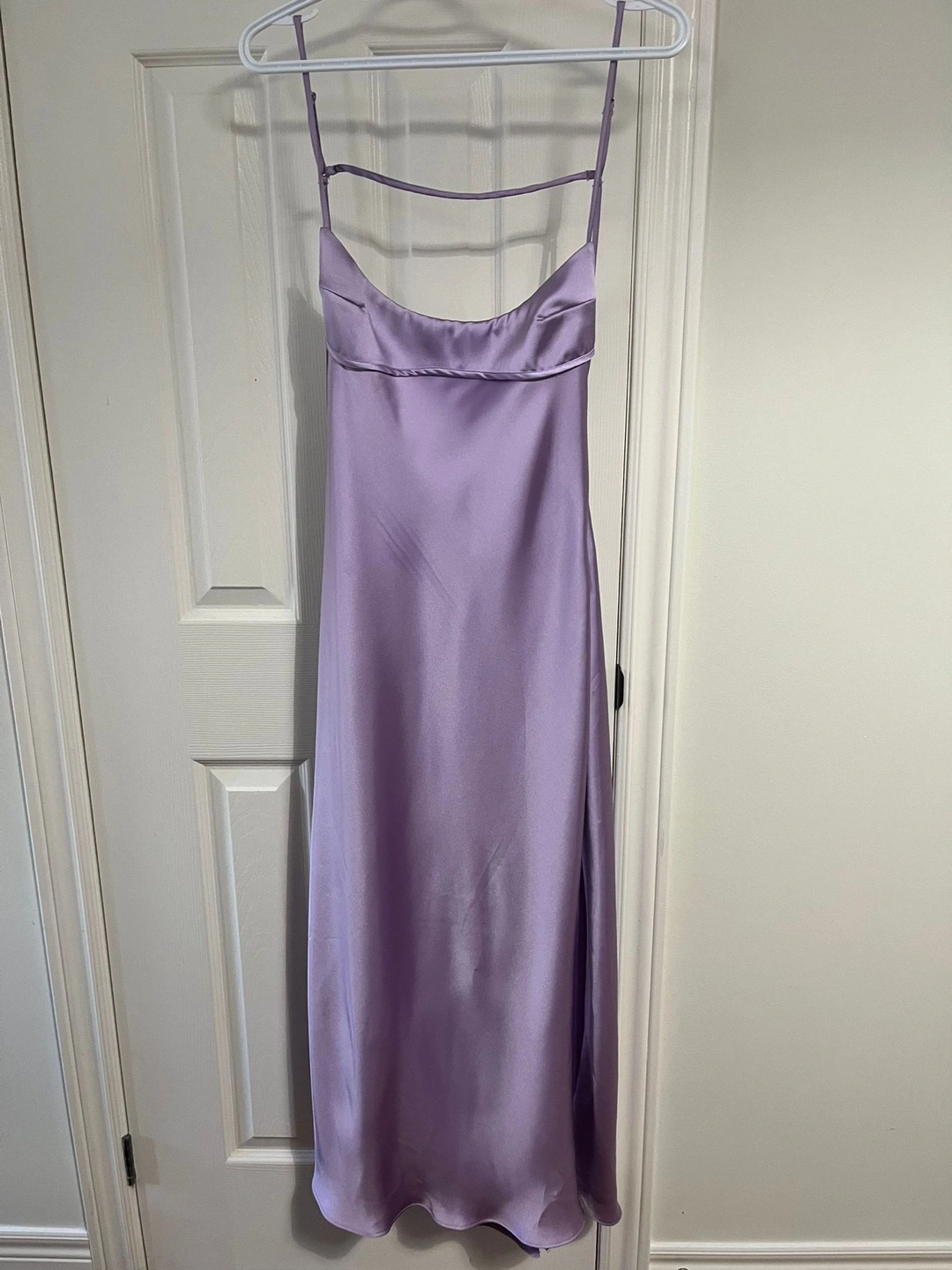 A beautiful dress in a soft, lavender colour. Sleeveless style, with a fitted bust and a flowing skirt. Features a subtle slit at the side. Perfect for a gentle evening out or for a wedding.