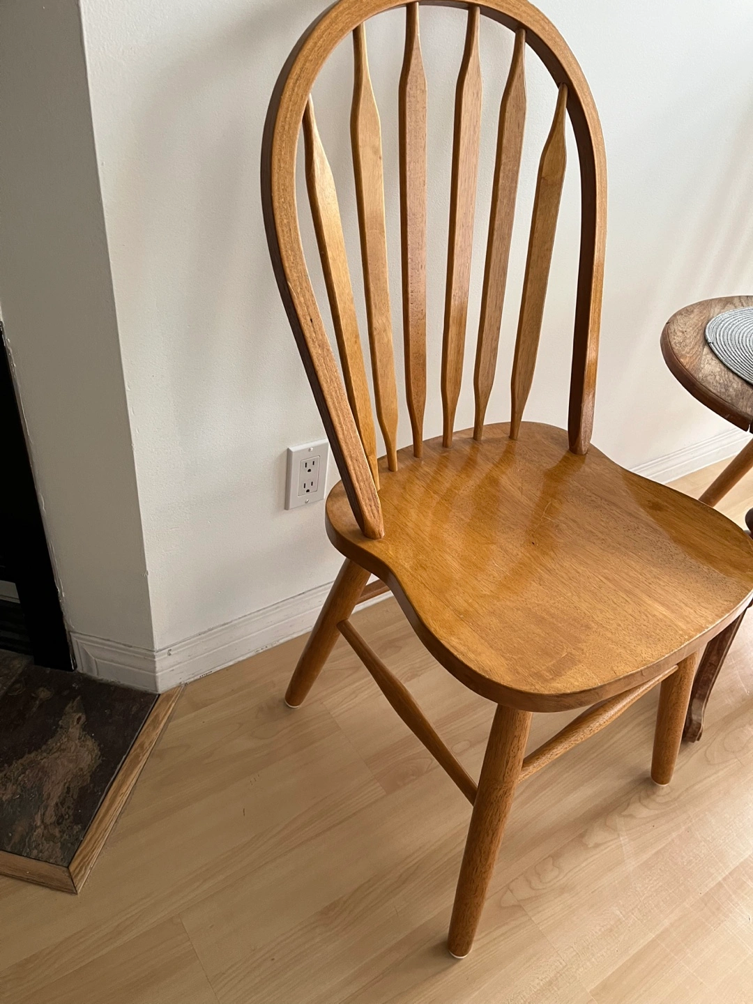 A wooden chair with a spindle back. The seat is curved. It would be perfect for enjoying a warm cup of tea.