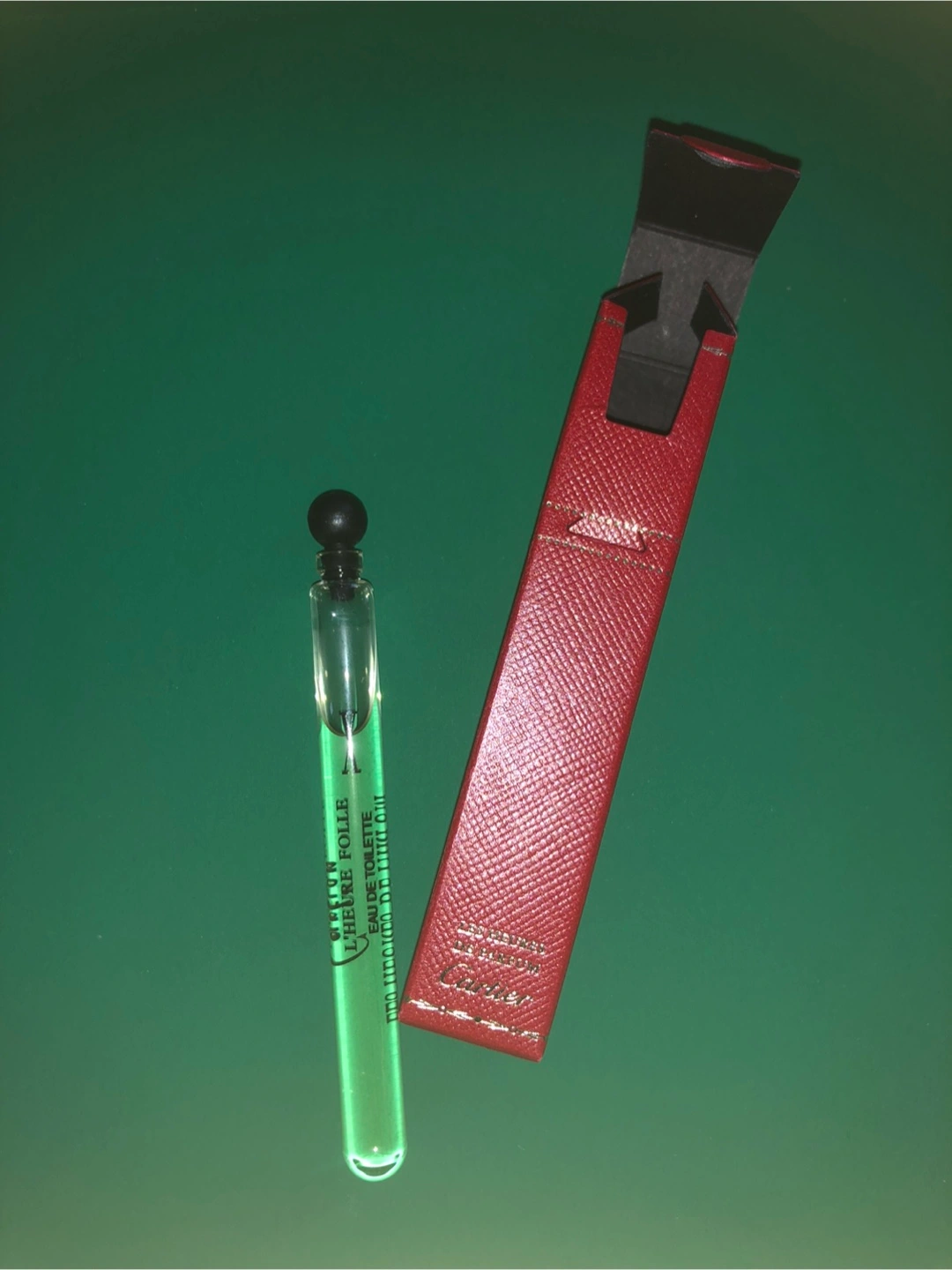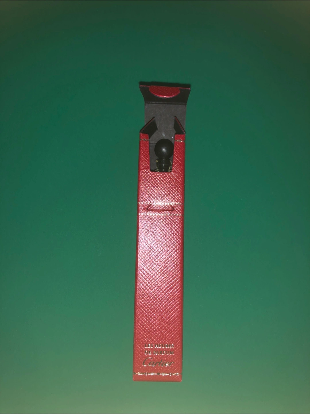 A perfume sample, with a glass vial. Red rectangular case, with the scent's name embossed. Great for trying out new fragrances before buying a full-size bottle, allowing you to discover new scents in a comfortable manner. 4ml