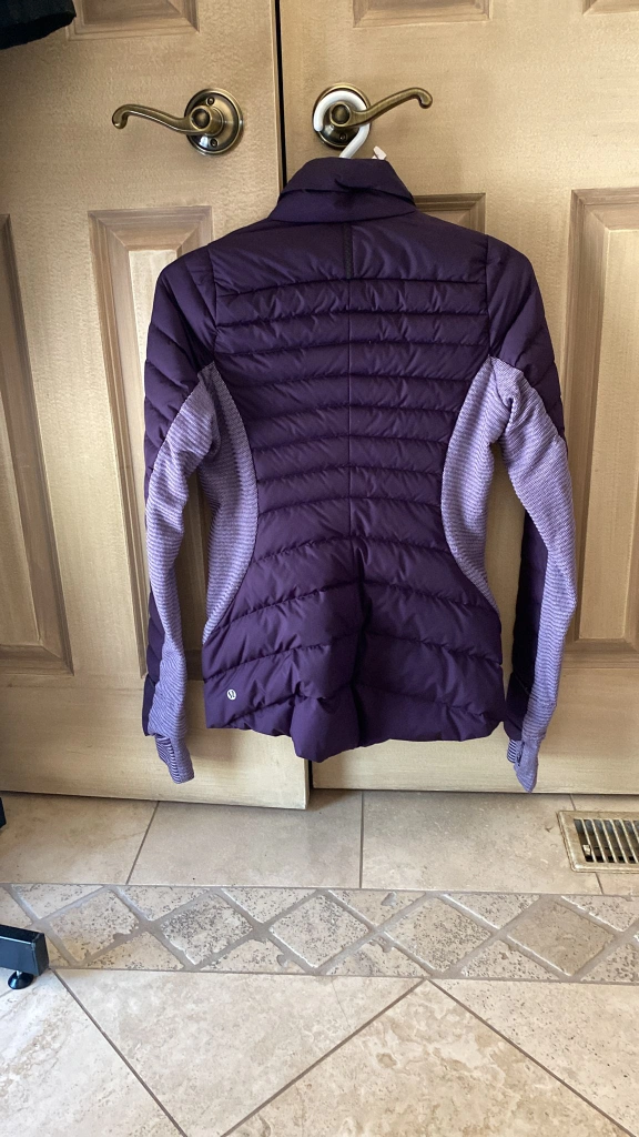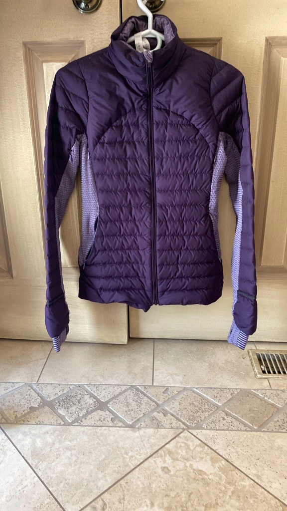 A stylish active jacket in a rich purple. Features a full front zipper and a flattering fit. Its design includes a quilted front and back, along with patterned sleeves. You can layer it comfortably for your morning run. paid 300