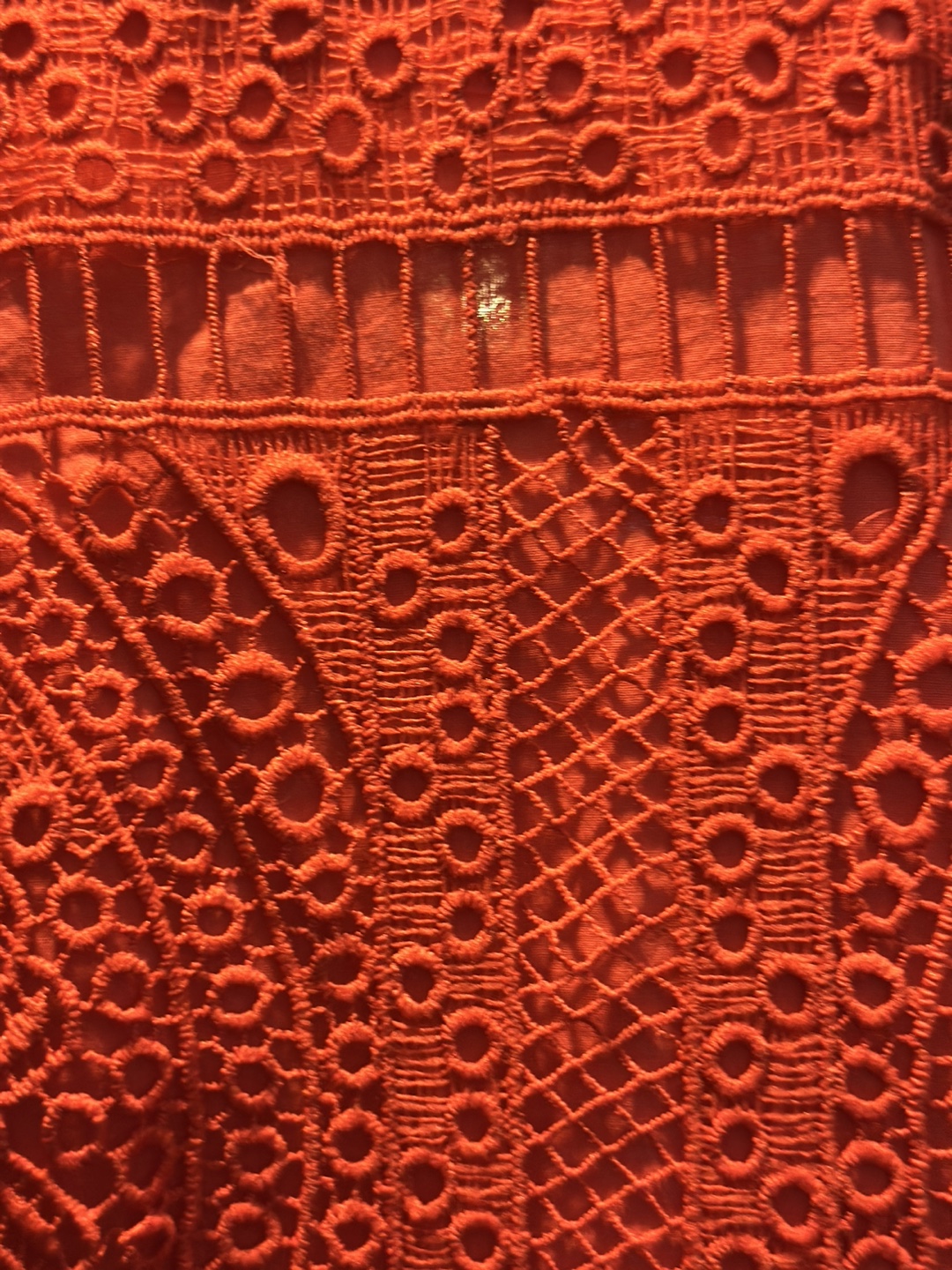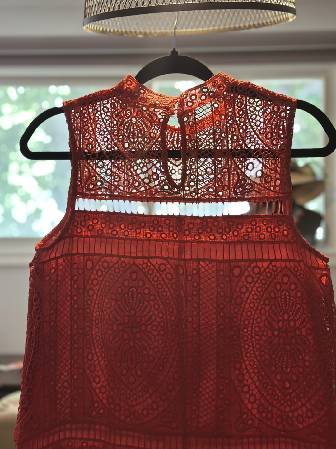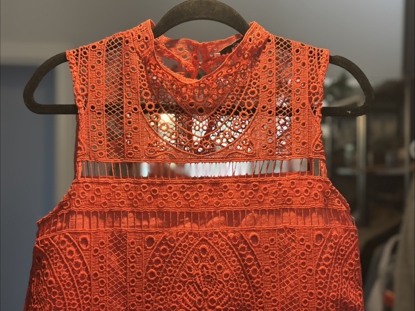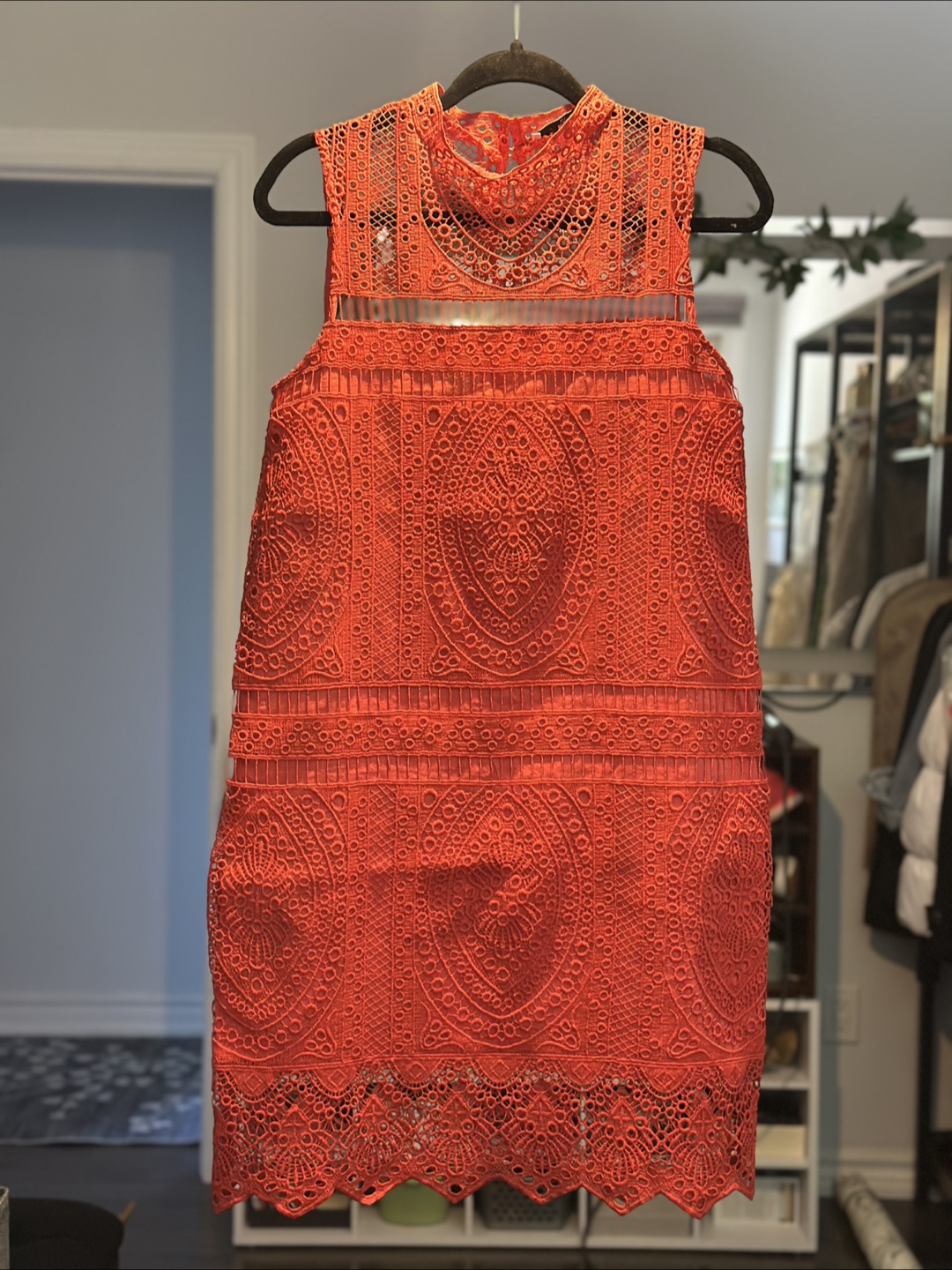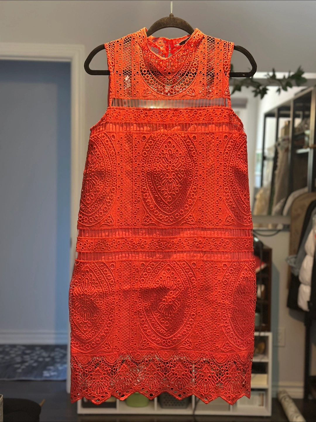 The dress is bright orange with an intricate lace design. Features a high neck and cut out detailing. A lovely dress for your next night out, or special occasion.