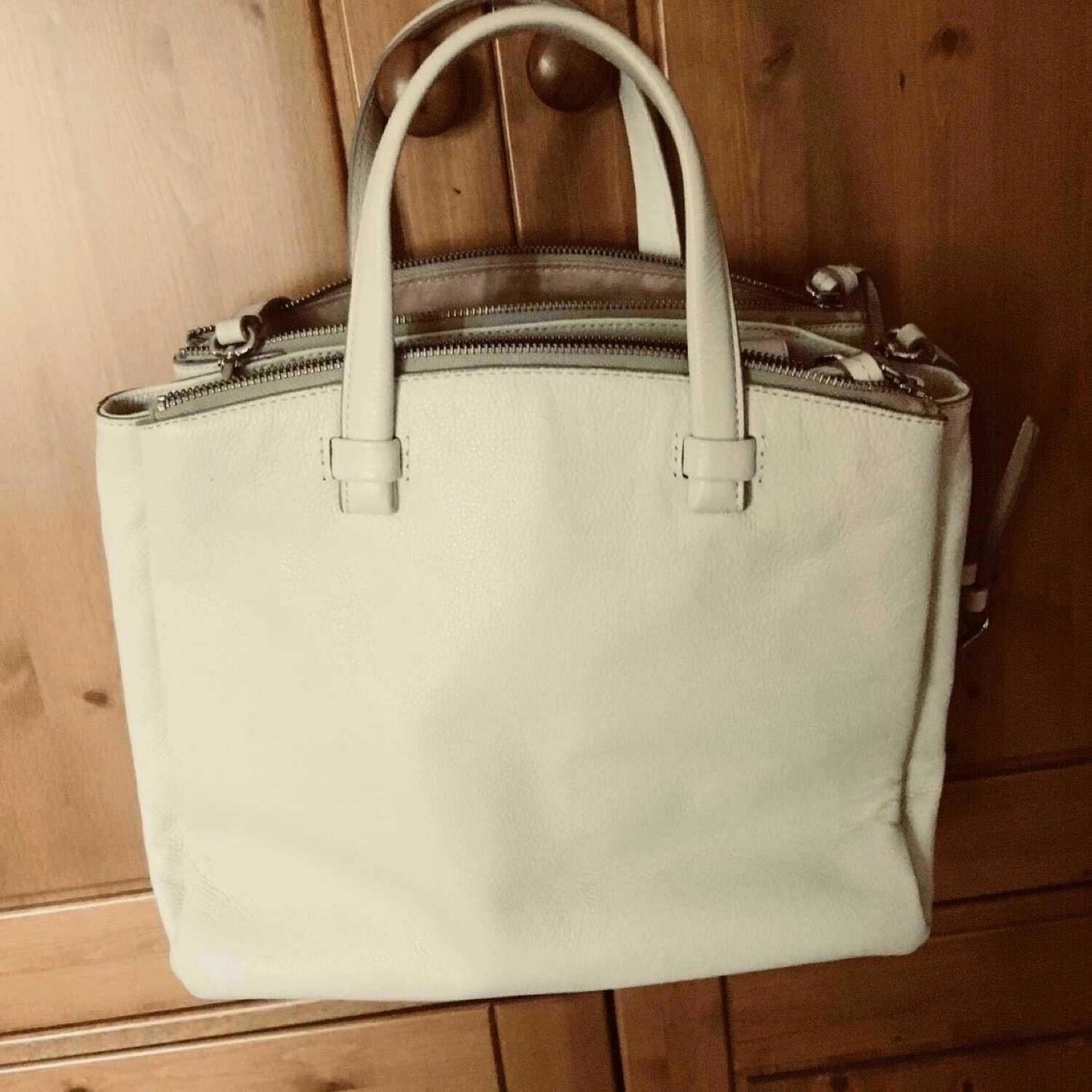 Lovely cream leather handbag with an optional crossbody strap. Featuring a zippered closure and multiple interior pockets.
