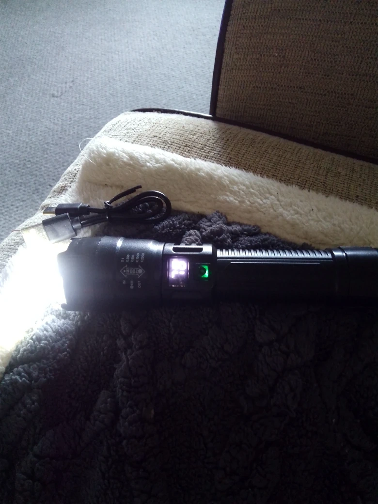 A flashlight with an LED light. Comes with a USB charging cable. Perfect for your nighttime walks, providing you with a sense of comfort and security at the same time.