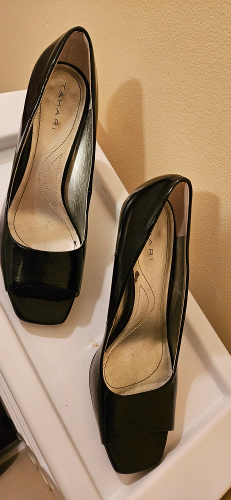 A pair of black heels with a peep toe. Features a glossy finish. Perfect for adding some elegance to your outfit.Worn 3 tines only .Well looked after as are all my things :)