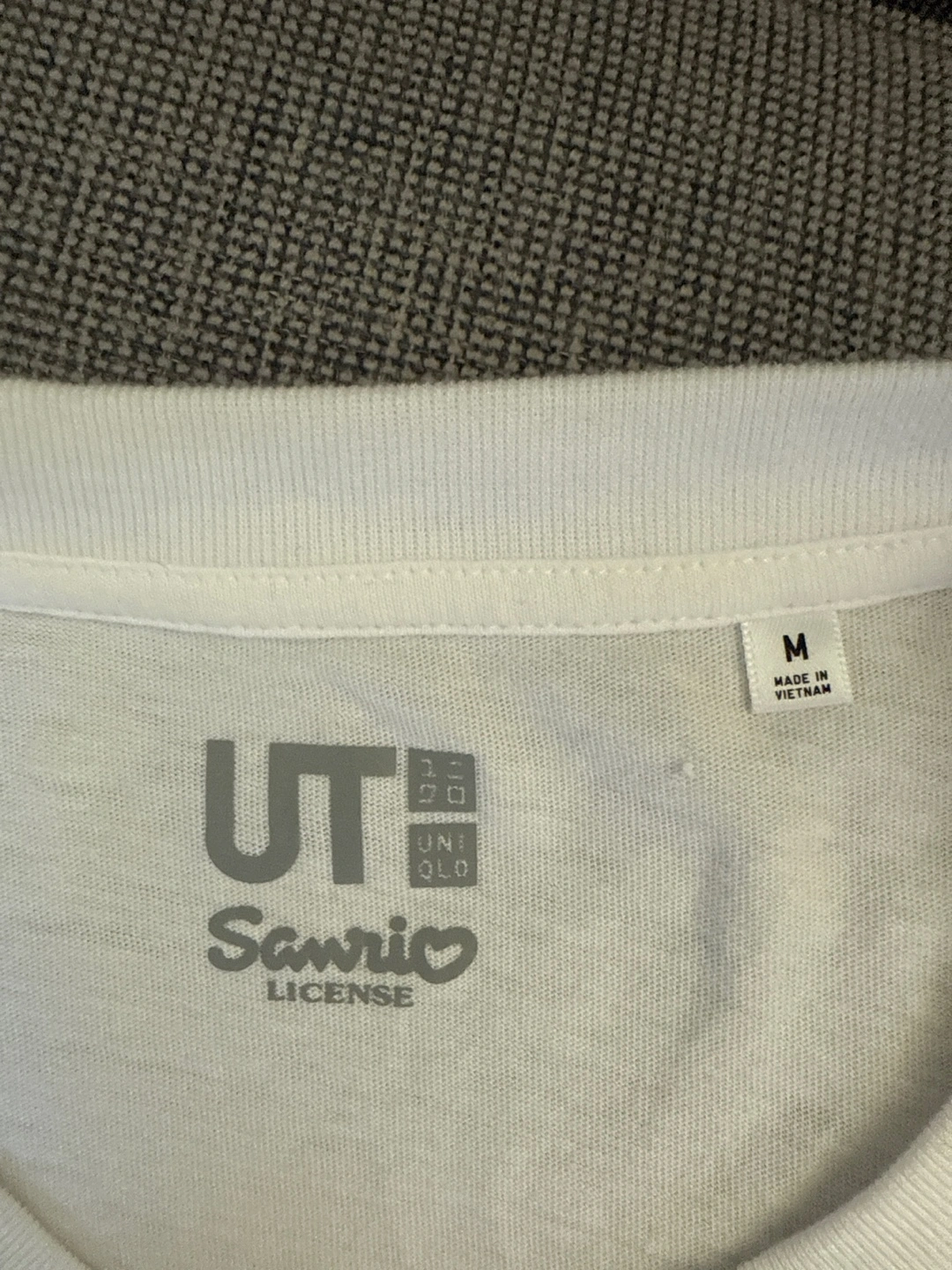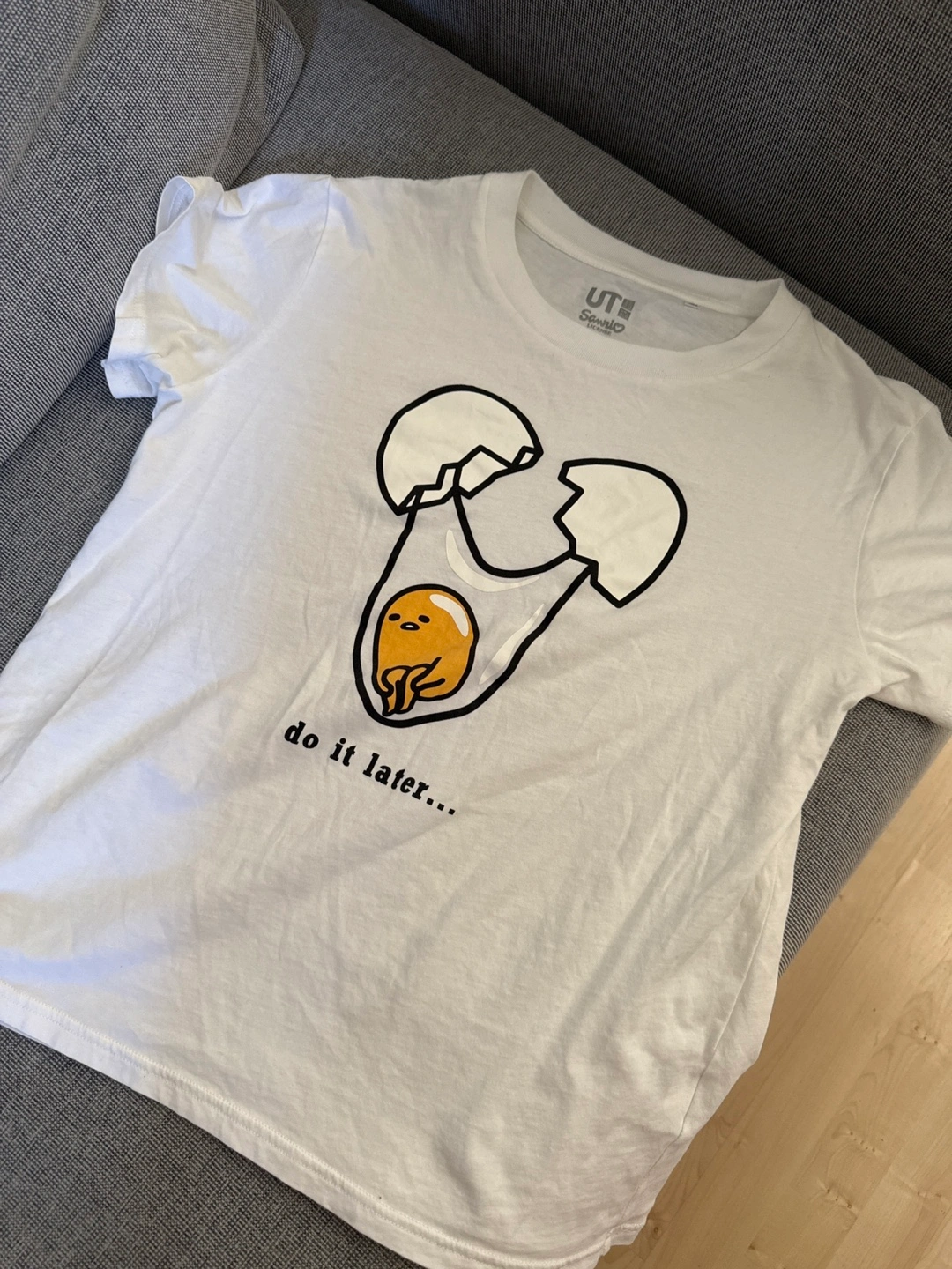 A white tee. Depicts Gudetama in an egg shell. Text saying "do it later..." on the front. Perfect to wear while relaxing at home. Uniqlo Sanrio
