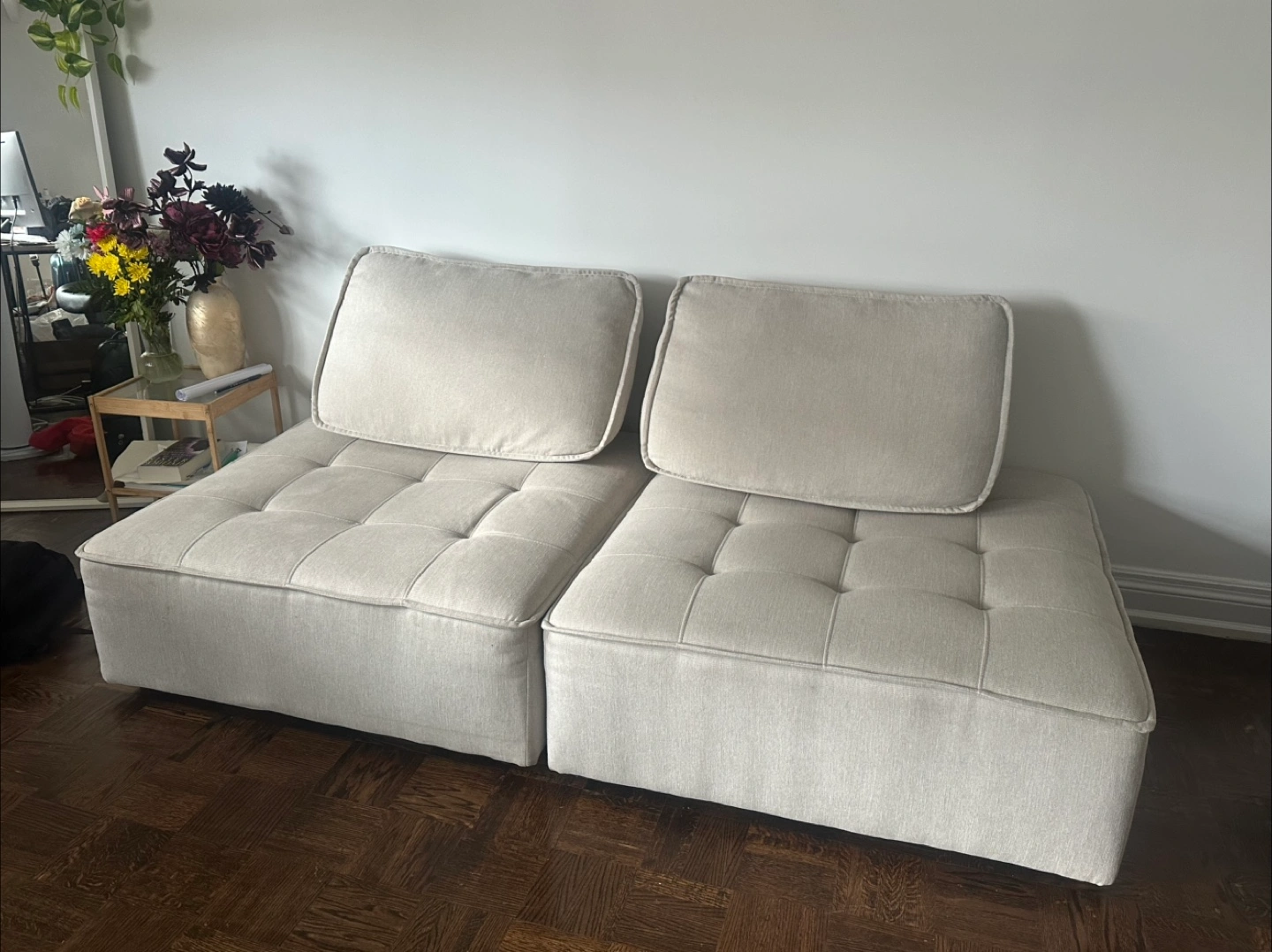 Structure two piece couch set (can be bought together or separately). Weighted backrests can be positioned anywhere, allowing for a truly customizable lounge experience. 1 year old