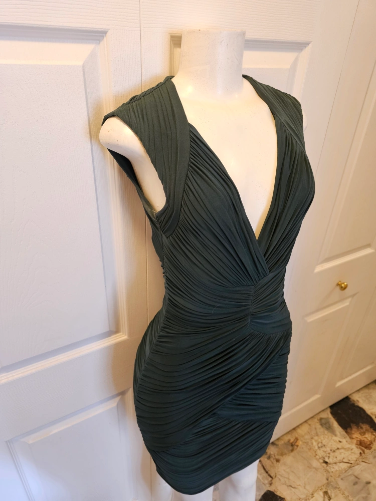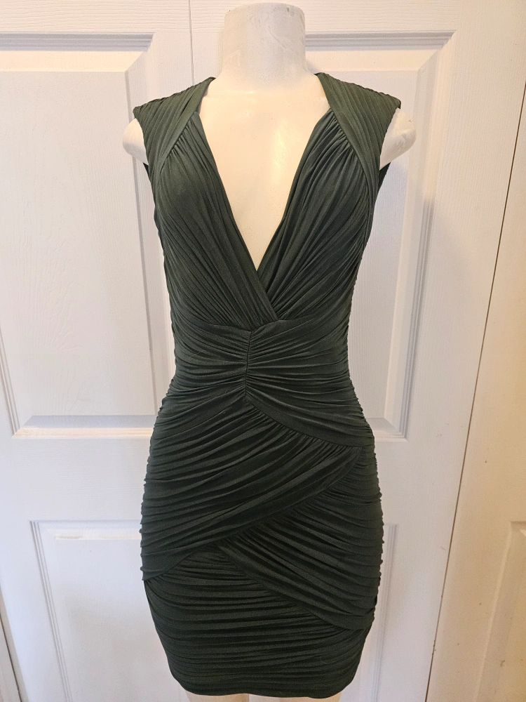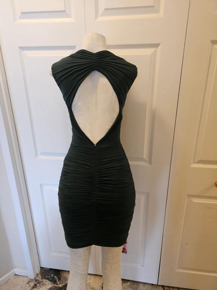 Deep green mini dress. Ruching details. Plunging neckline. Sleeveless. Keyhole low back. You will want to wear this piece to your next event.