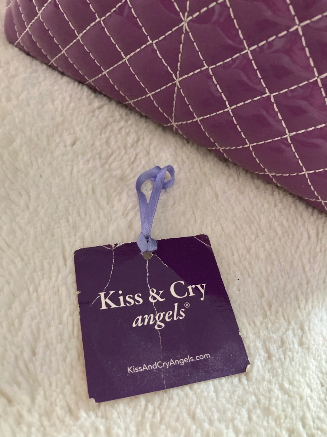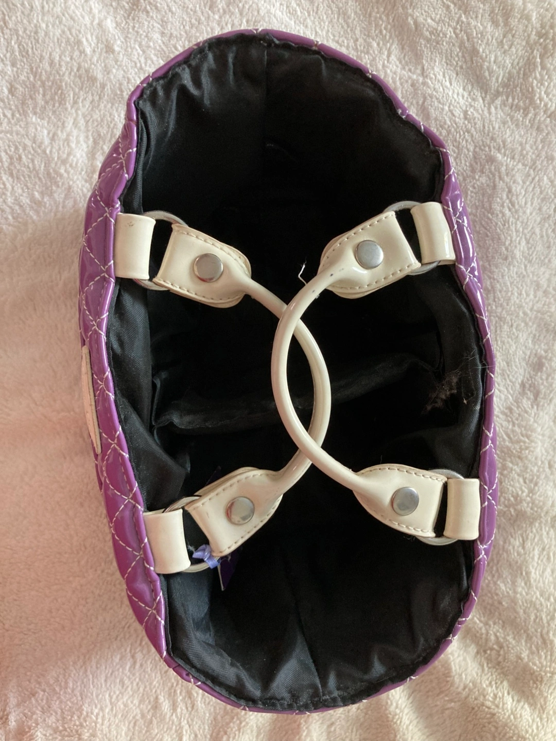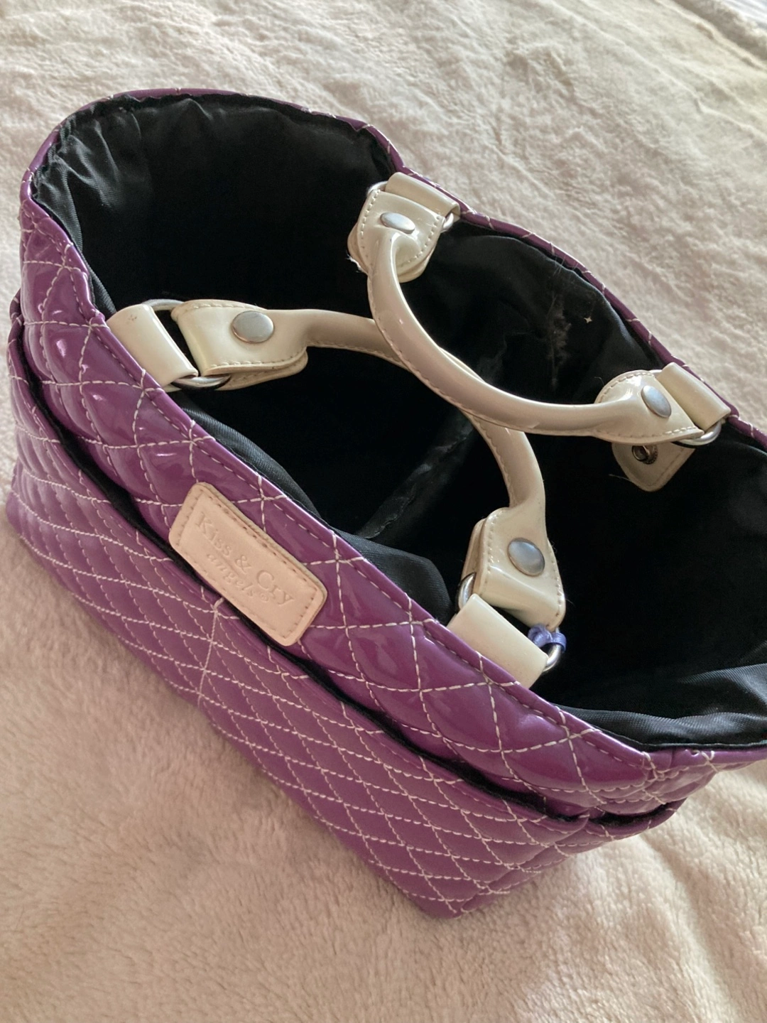 A beautiful handbag in a purple hue. It has a quilted pattern and cream-coloured handles.