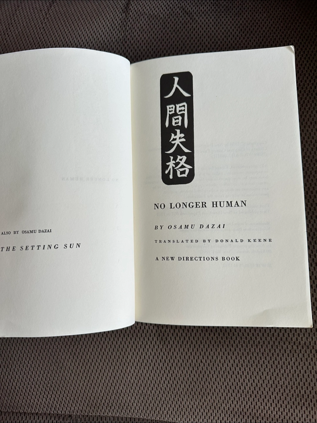 Features a pink cover and the title 'No Longer Human'. The book is by Osamu Dazai and translated by Donald Keene. The paperback's cover has some minor wear and tear. Spine is in great condition, no writing on the pages. This book is perfect for a relaxing evening of reading. Smoke free home.