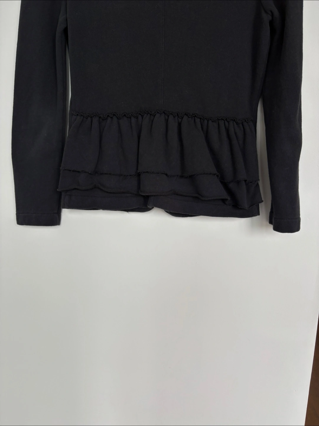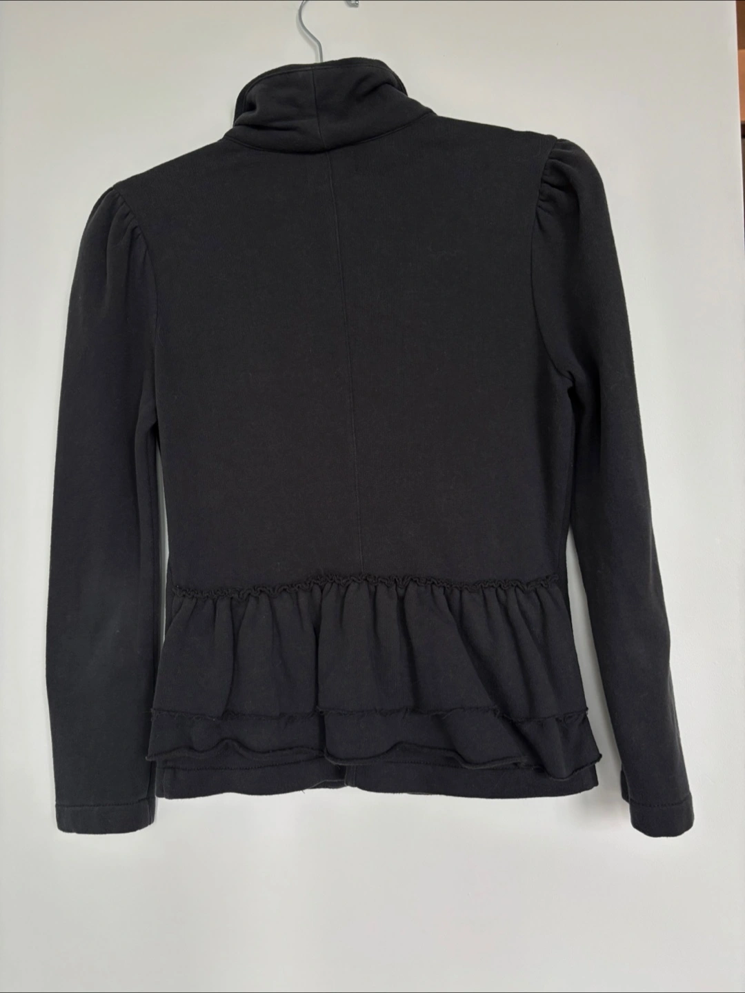 The blazer is black, with a single button closure. It has a stylish shawl collar and detailed sleeves, as well as a ruffle trim at the waist. It would be perfect for a cozy night out.