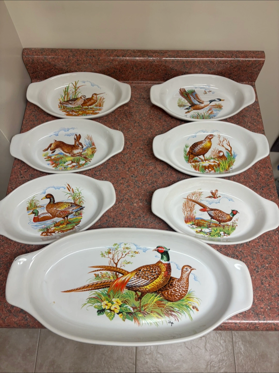 These dishes feature wildlife illustrations. The set includes a large serving platter. The shape is oval with handles on either side, perfect for serving family and friends.