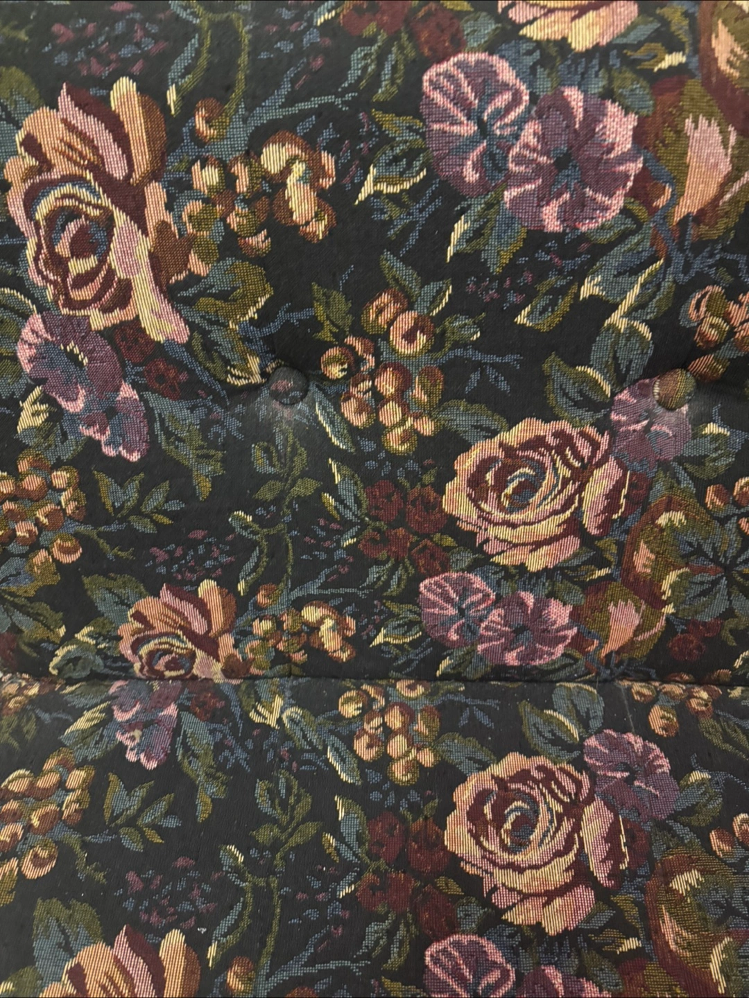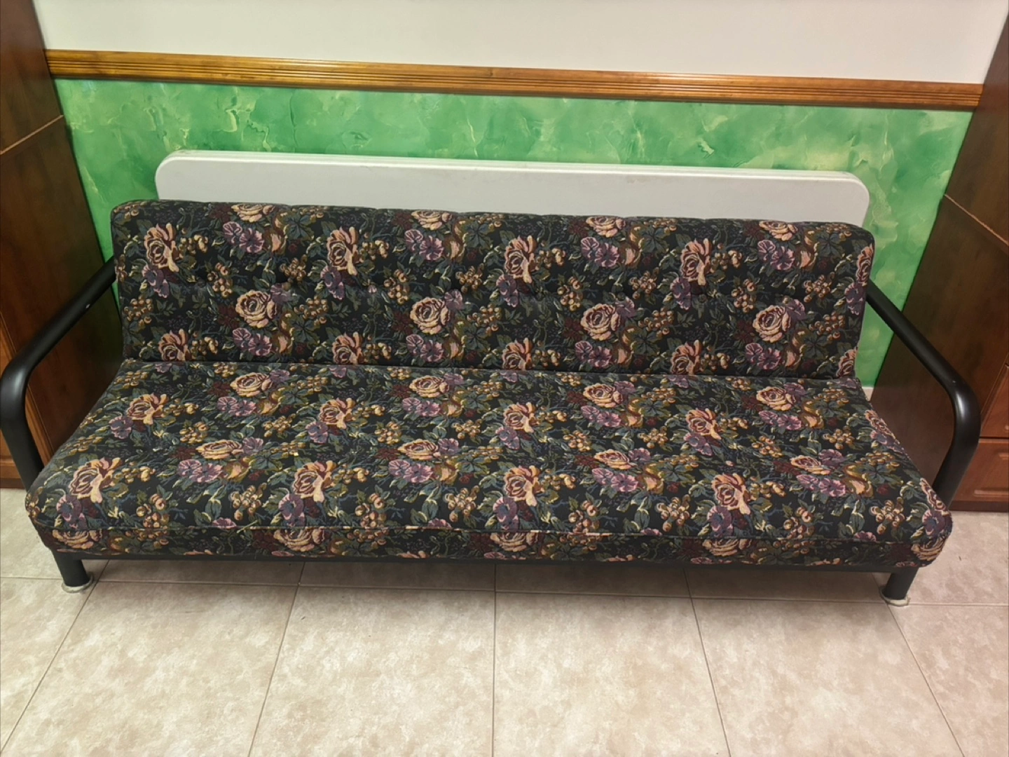 The sofa features a colorful floral print. It is a convertible sofa. The back of the sofa can be adjusted. Perfect for reading a book or taking a nap.