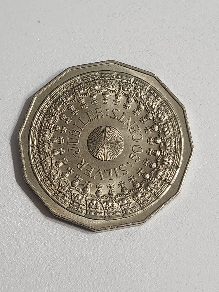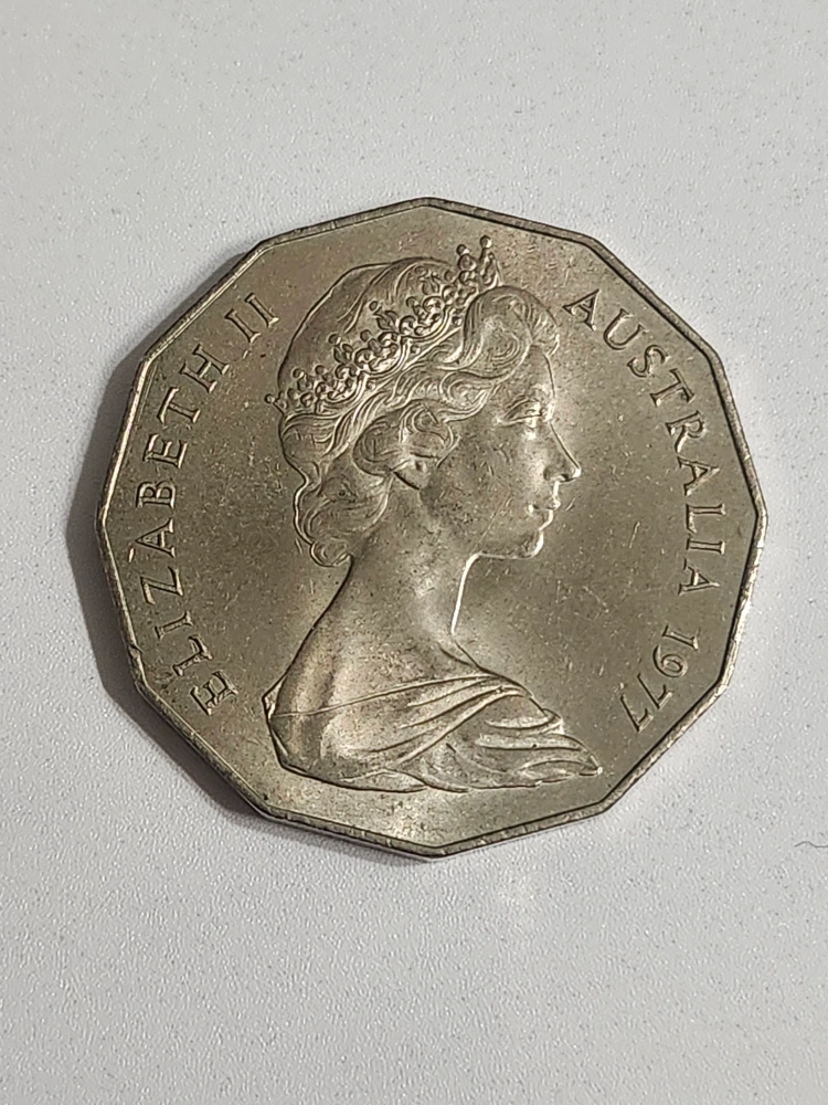 Features Queen Elizabeth II. A coin with a silver appearance. This coin could be a great addition to any coin collection, bringing a touch of history and nostalgia to the hobby.