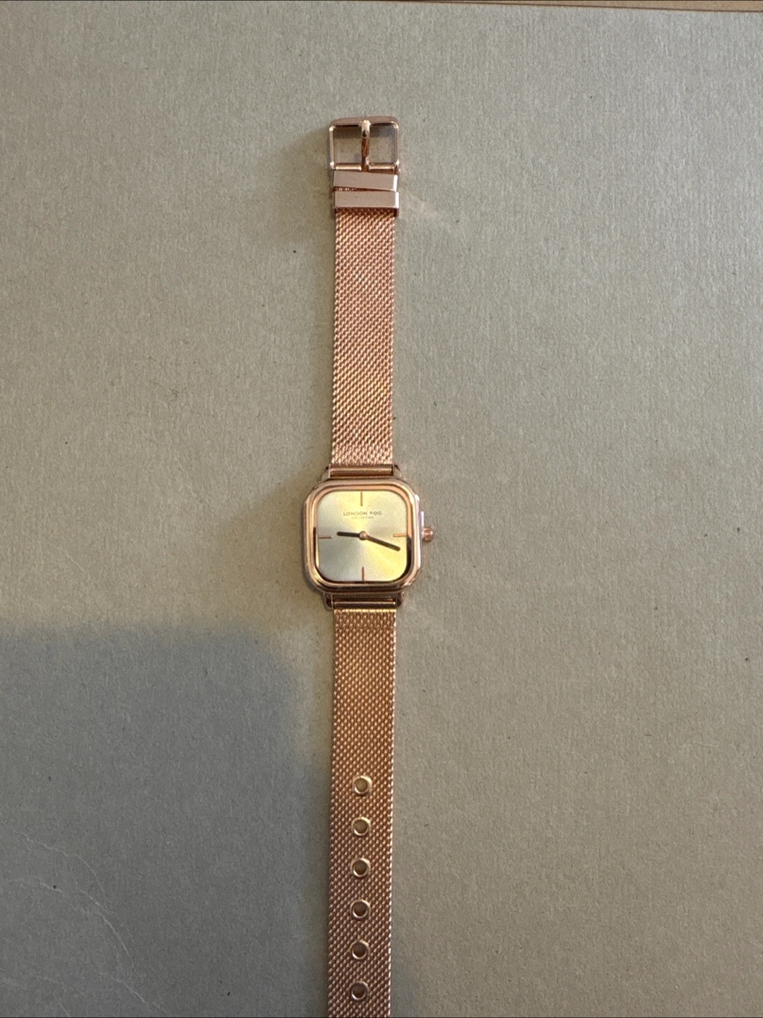 A rose gold watch. A mesh strap. The watch face has a square shape. Such a beautiful watch to keep track of the passage of time with.