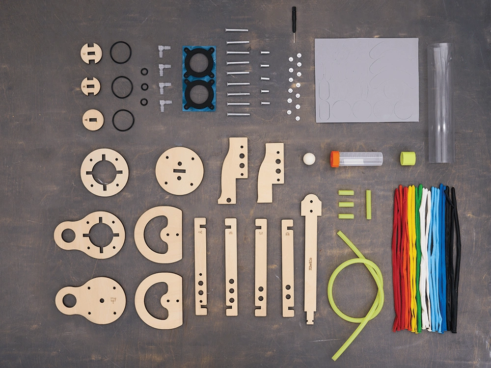 This wooden toy, disassembled, with hardware, and extra colored tubes. Comes with a clear tube, several other pieces. You can build this at home and let yourself be lost in the moment with it.