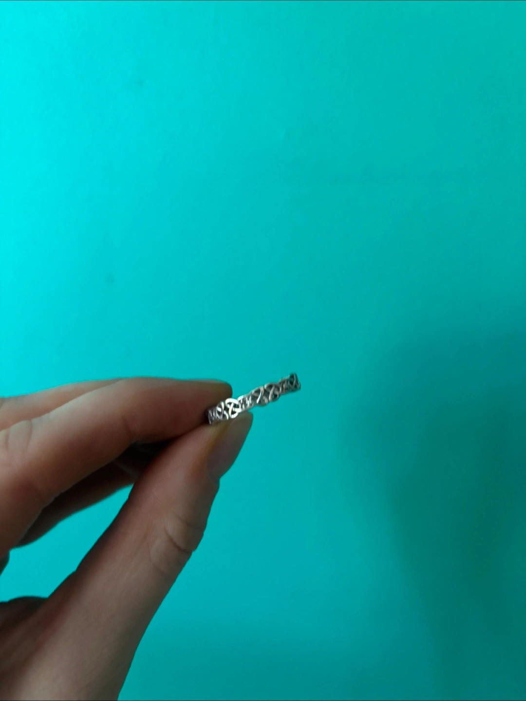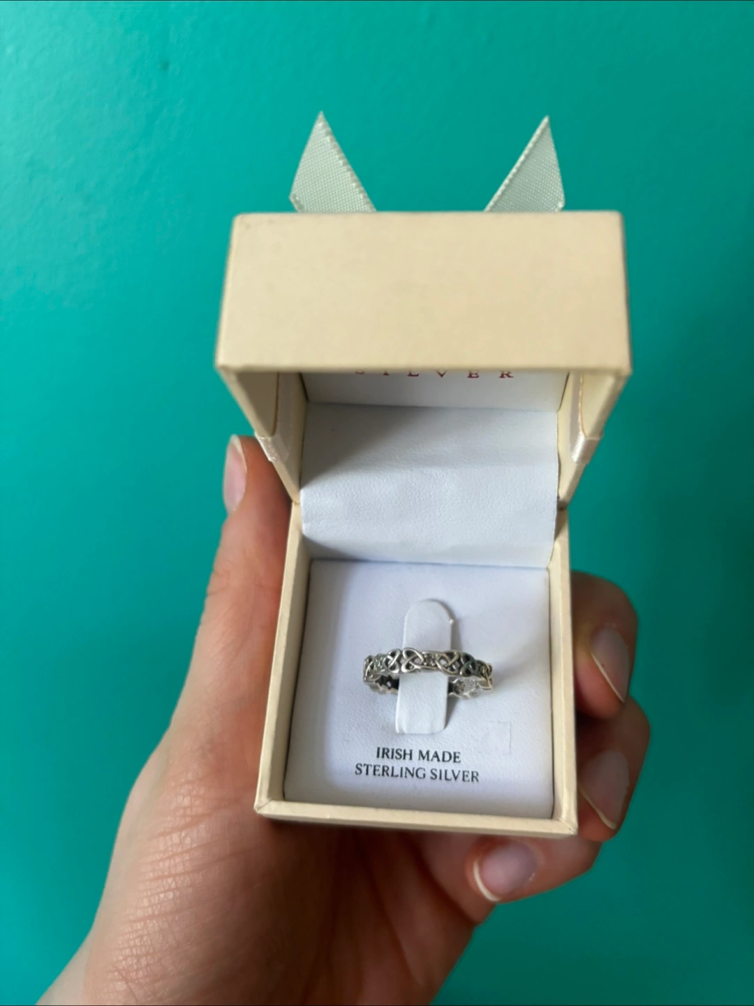 Braided silver ring, made in Ireland. Has three small diamonds on it. 925 sterling silver, size 6. Comes in original box and with a polishing cloth