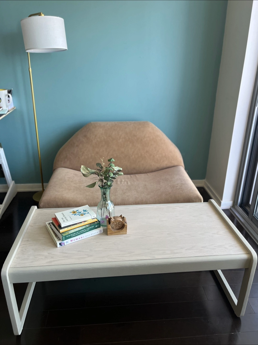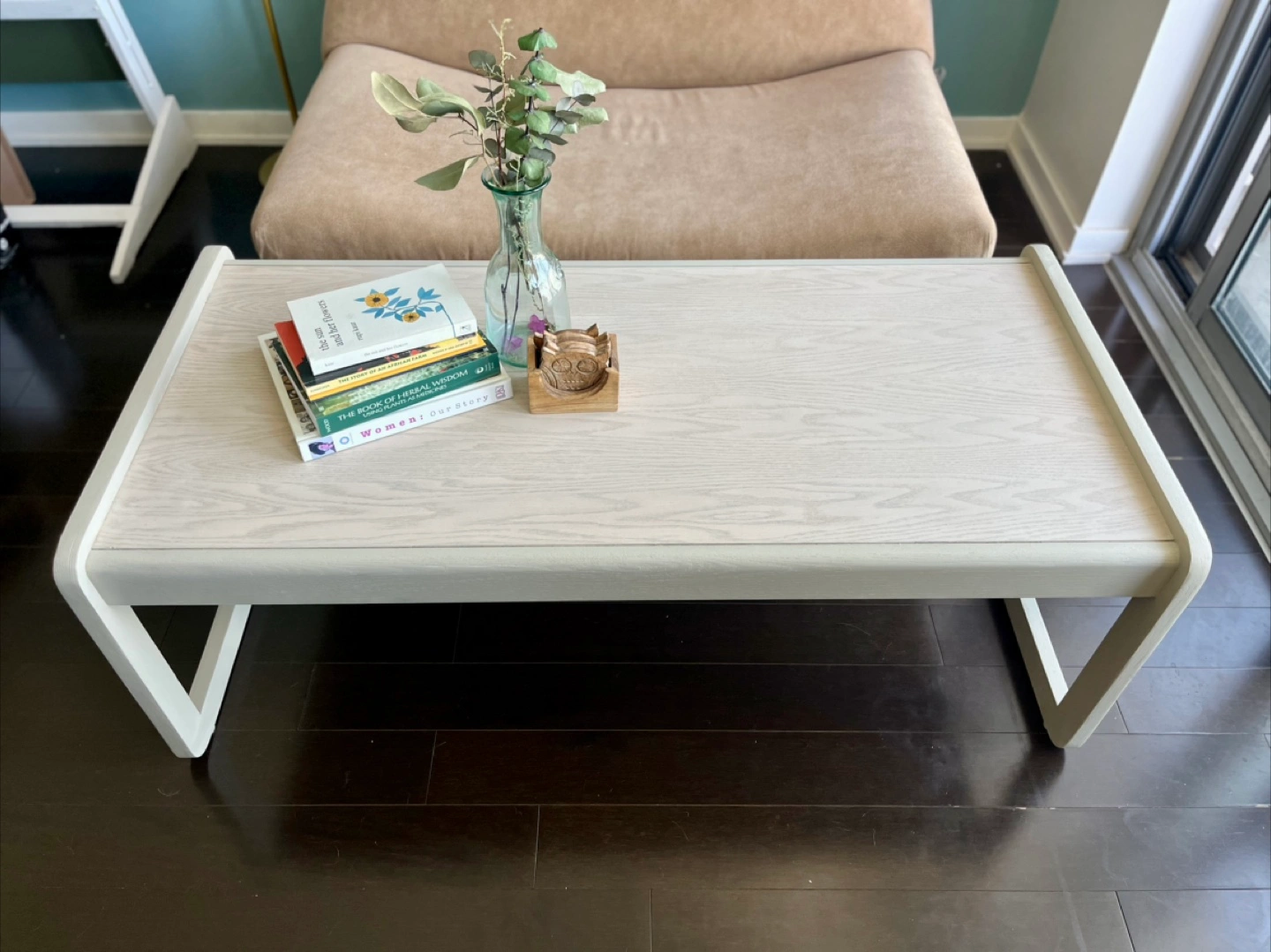 A coffee table with a neutral aesthetic. Features a rectangular top with a light wood grain effect. This table would be perfect for a quiet evening of reading.