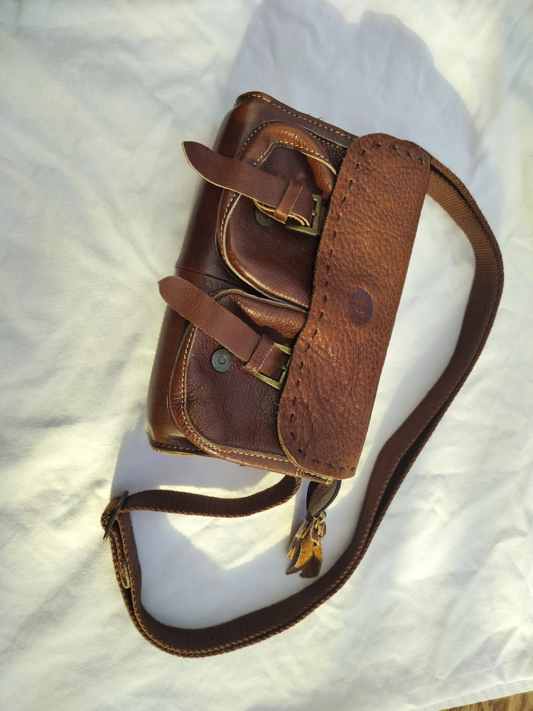 The brown leather bag features a shoulder strap. Has multiple pockets and compartments. Perfect for keeping your belongings organized. You can use this bag to carry your things on a relaxing afternoon walk.