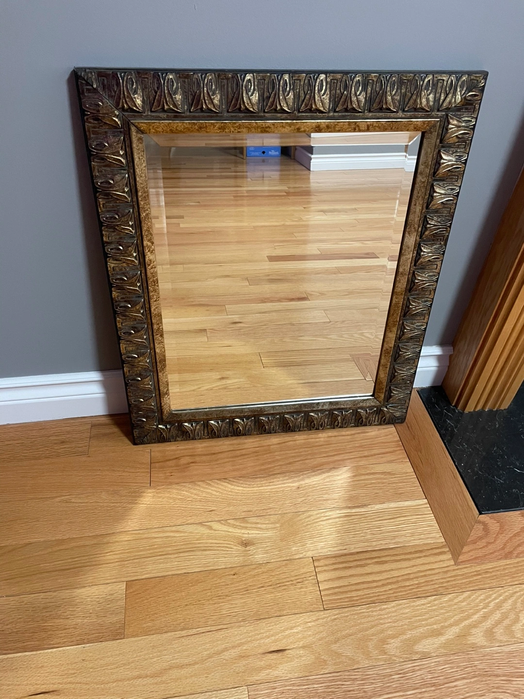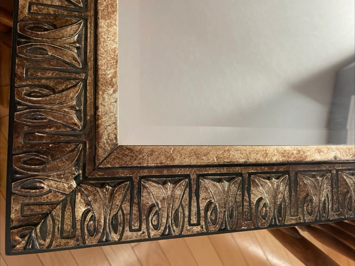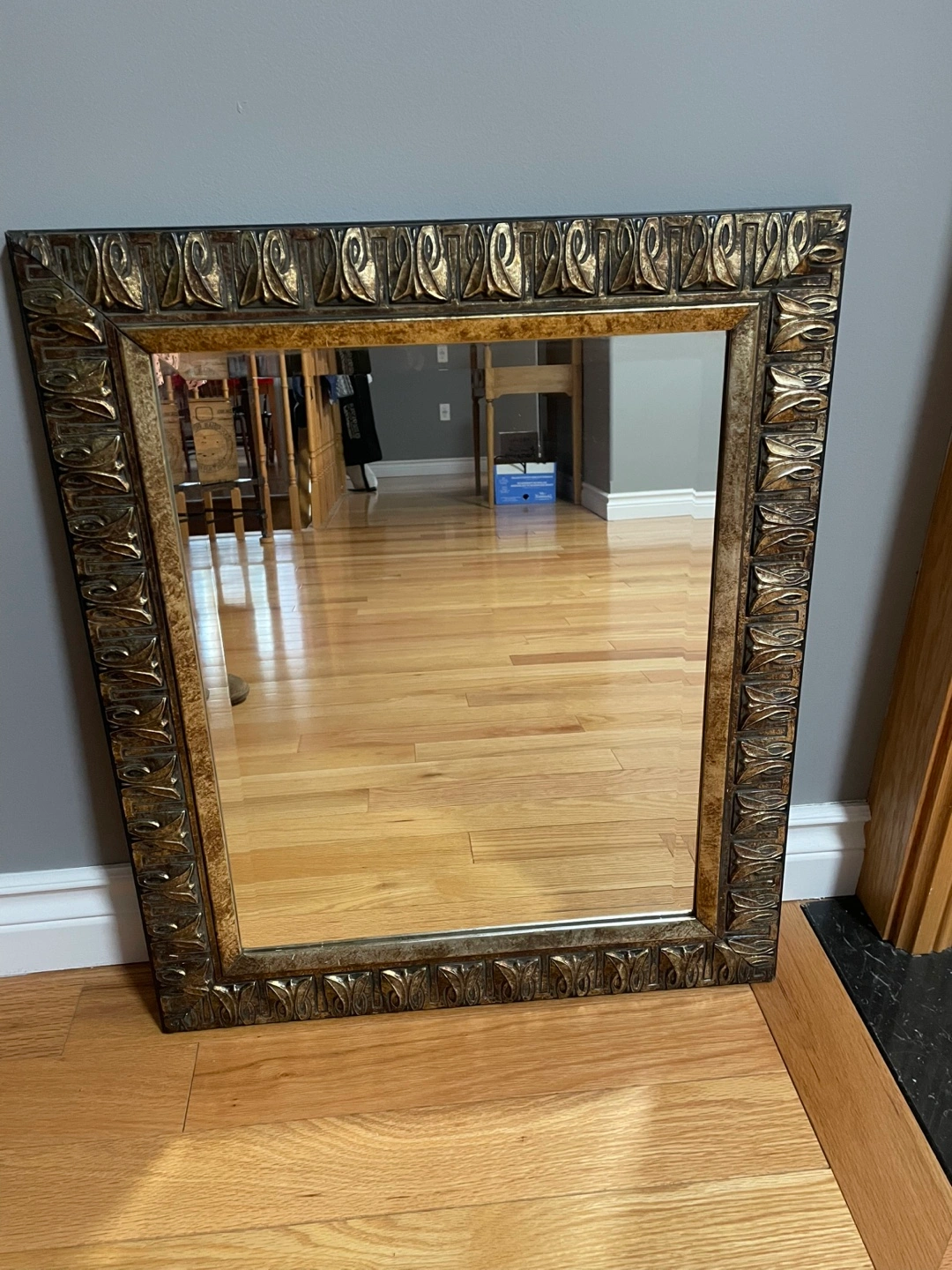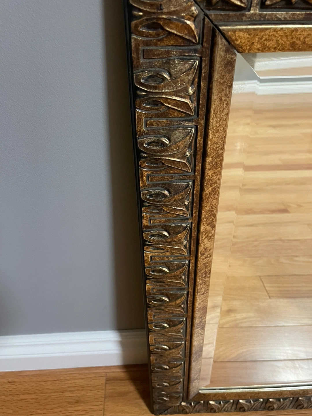 Enhance your home decor with this elegant beveled mirror, perfect for adding a touch of sophistication to any room. This mirror features a beautifully detailed bronze-coloured frame that complements its reflective surface. Please note that this item is in used condition, and is sold as-is. There may be minor signs of wear.