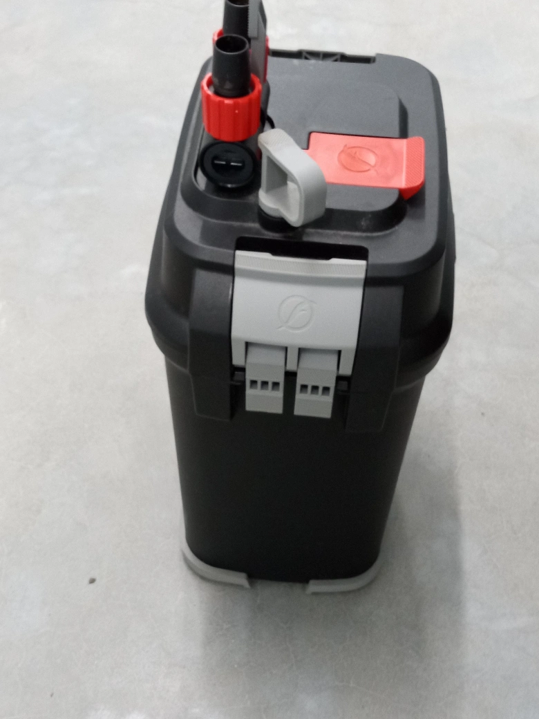 A black and grey filter. There are red and grey parts. There is a red flap on top. Great for keeping your fish tank pristine and healthy.