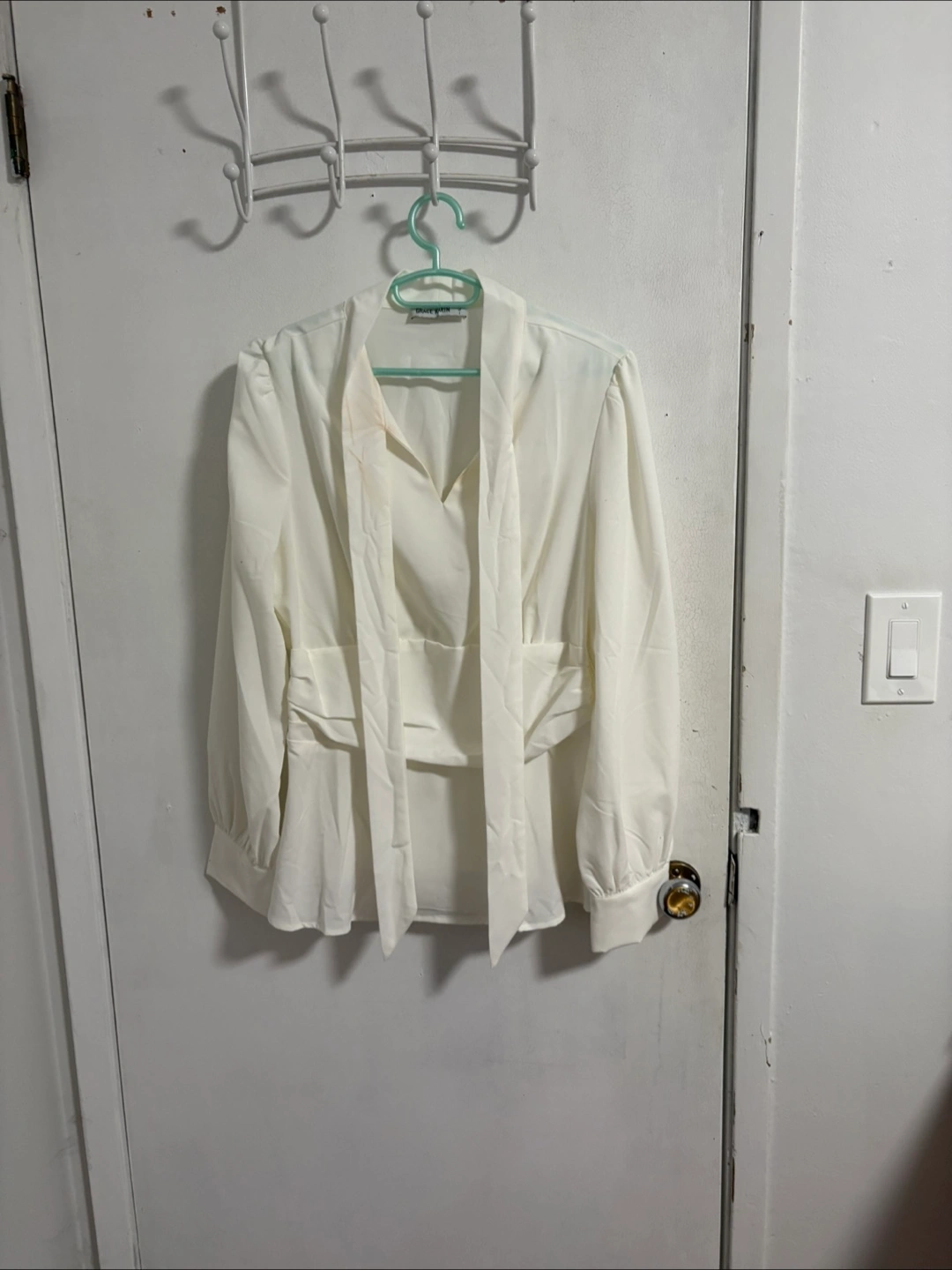 Beautiful cream-coloured blouse. Featuring long sleeves and a tie neck. A perfect addition to your work wardrobe. You may feel more calm and collected knowing you have this blouse to wear to your office.