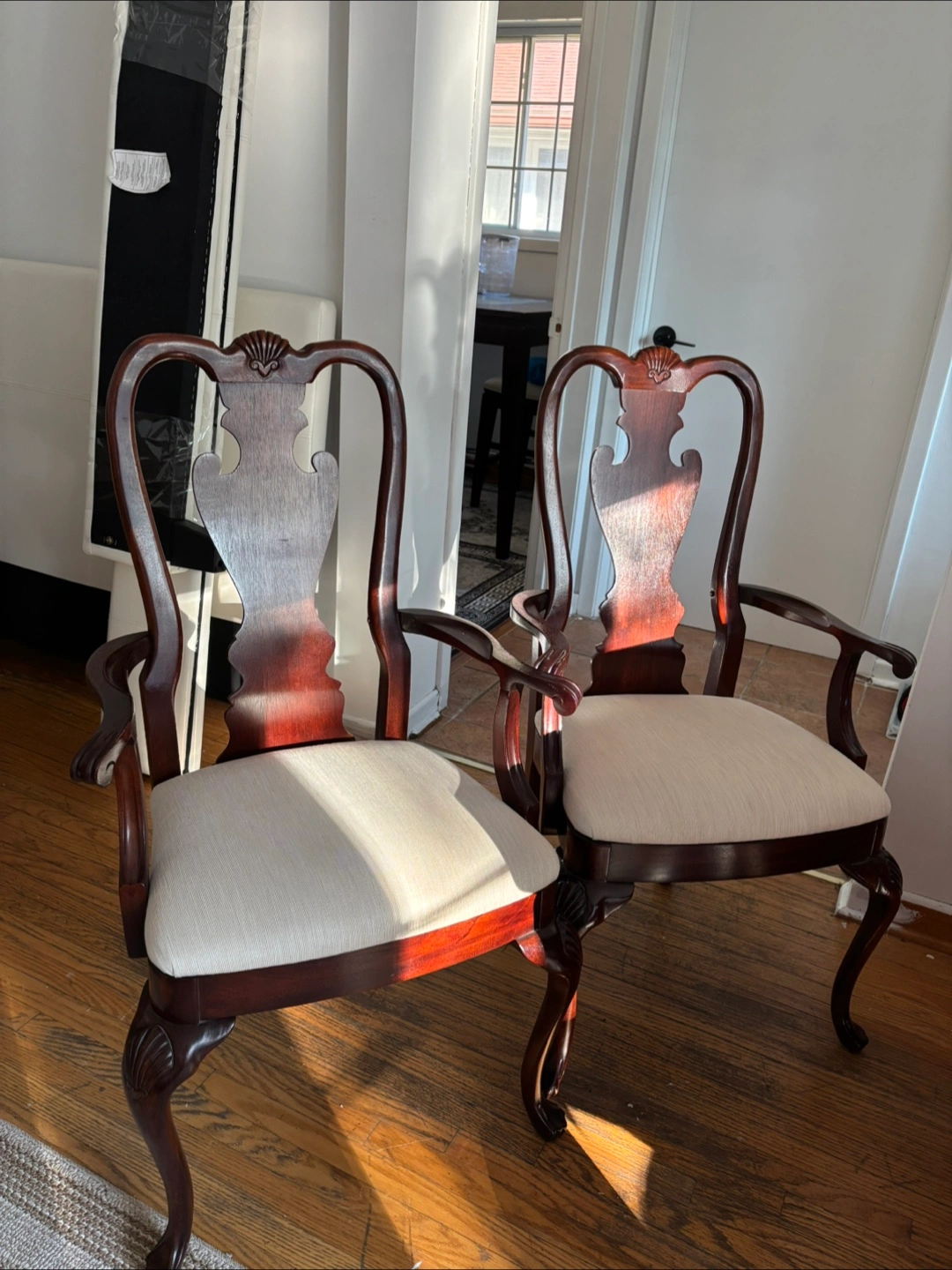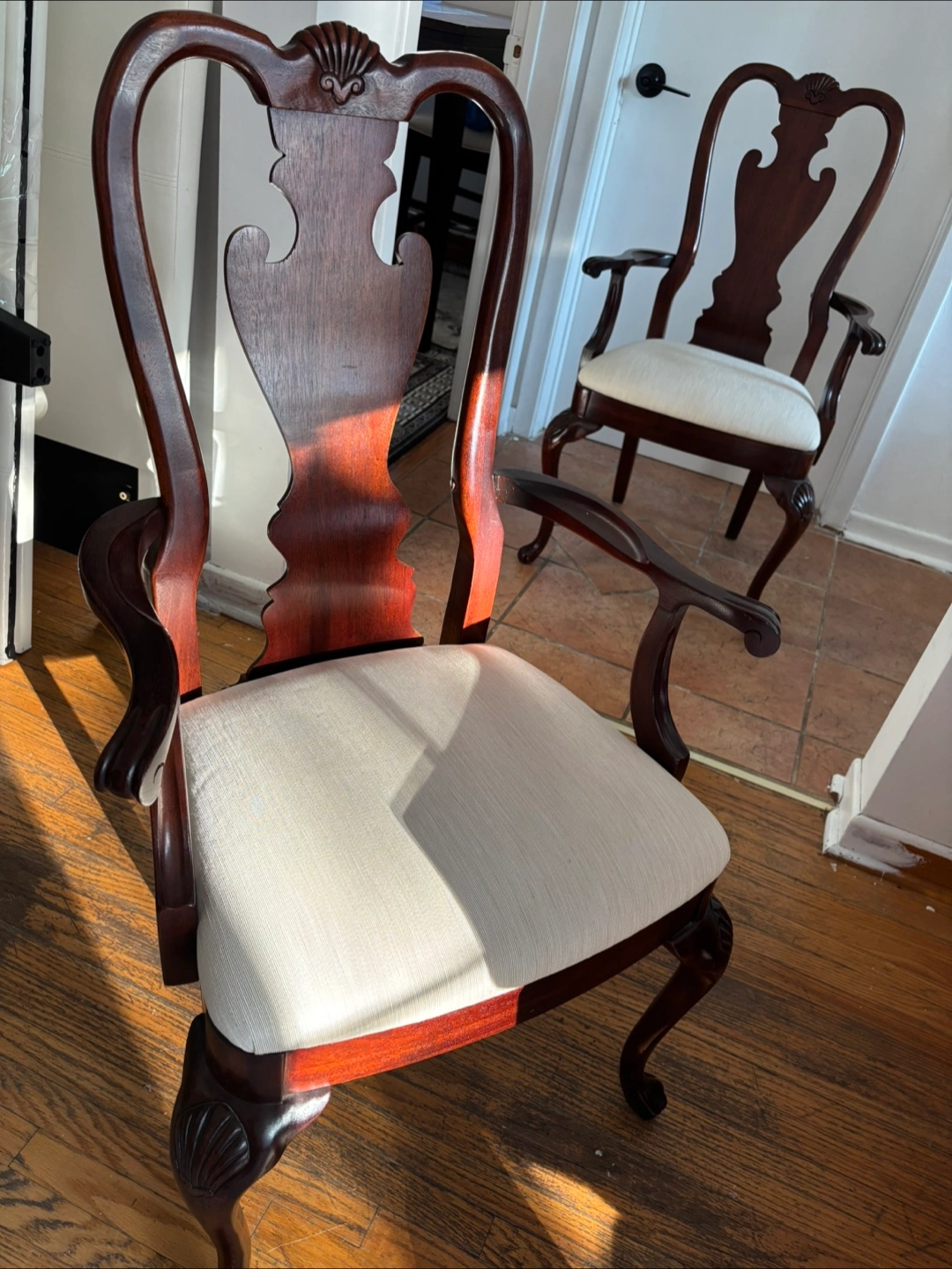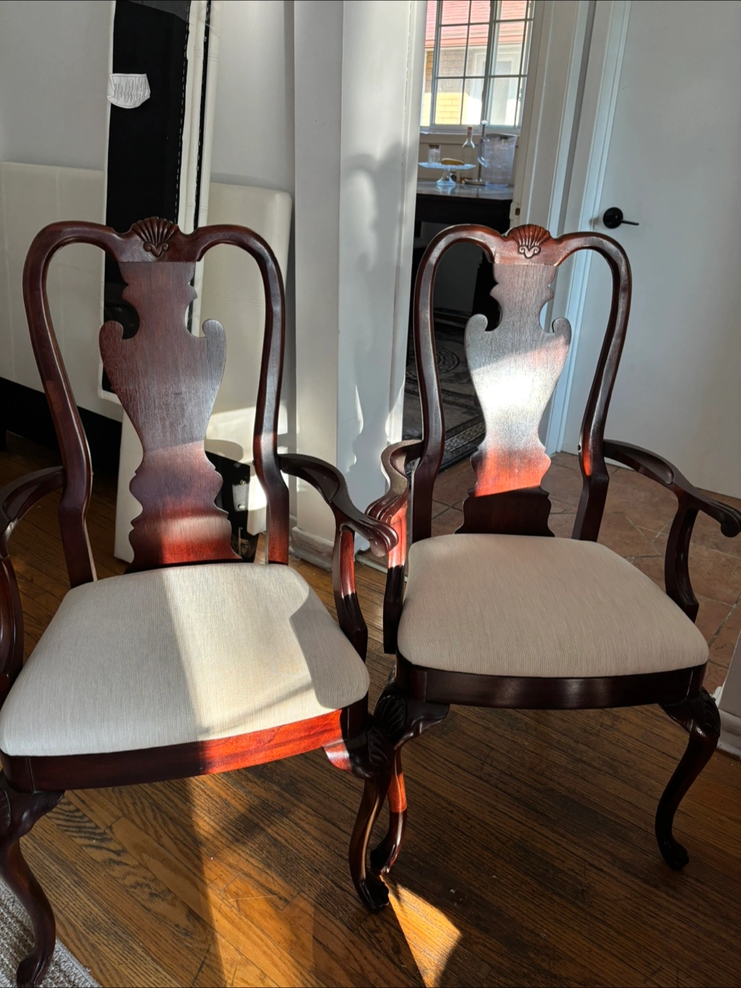 The wooden frames provide a classic look. Featuring curved arms and legs. Upholstered seat cushions. A warm ambiance can be created by simply sitting in these chairs with a cup of tea.