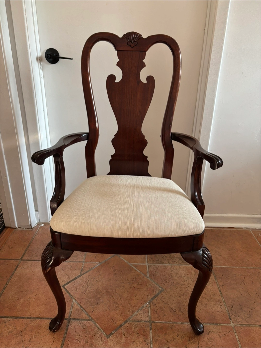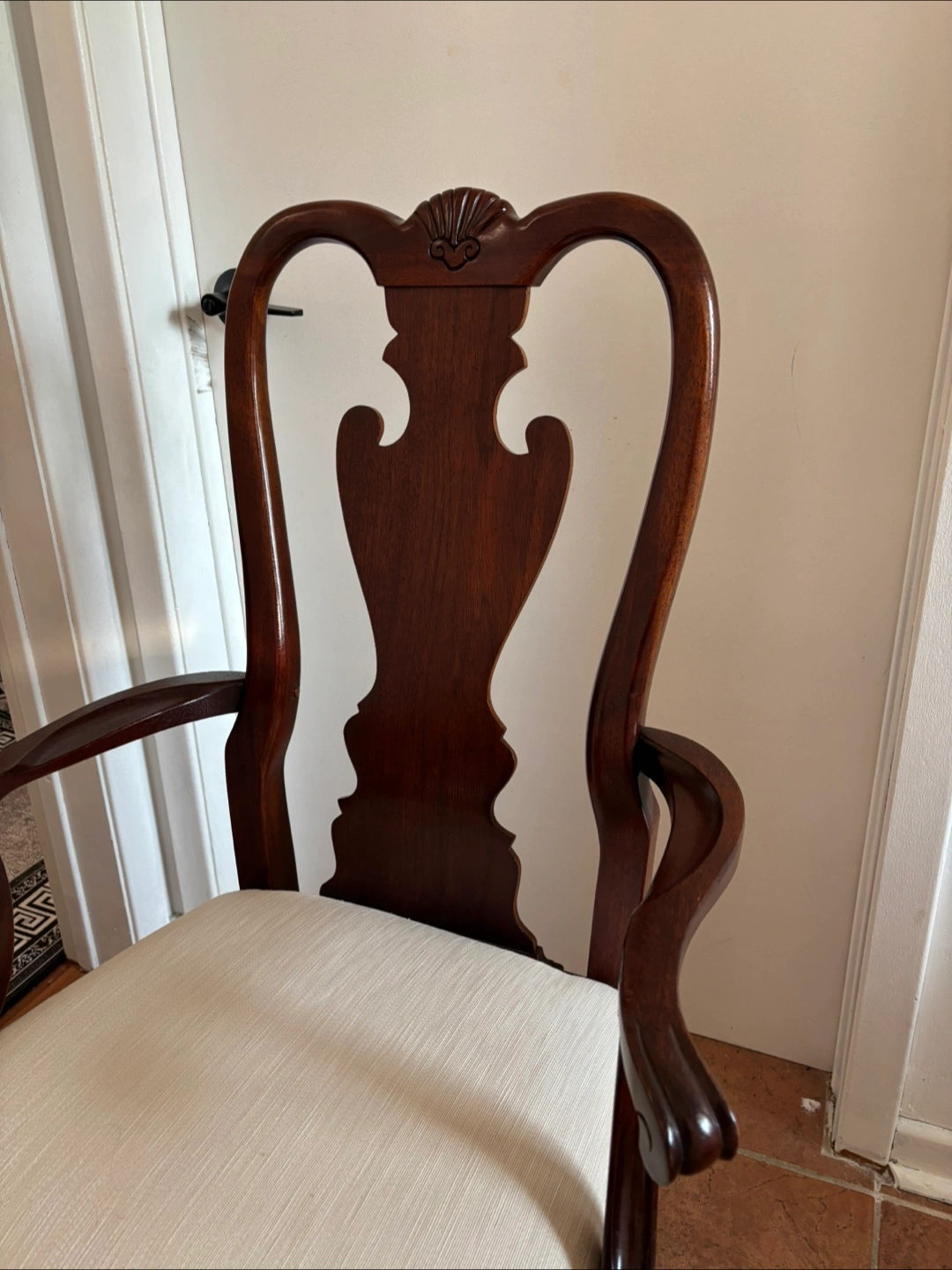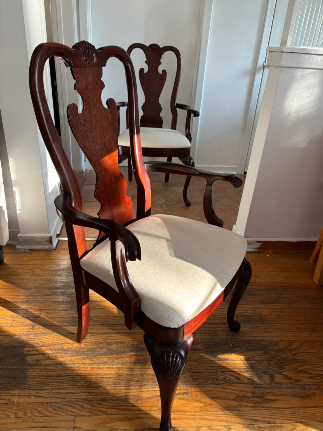The wooden frames provide a classic look. Featuring curved arms and legs. Upholstered seat cushions. A warm ambiance can be created by simply sitting in these chairs with a cup of tea.
