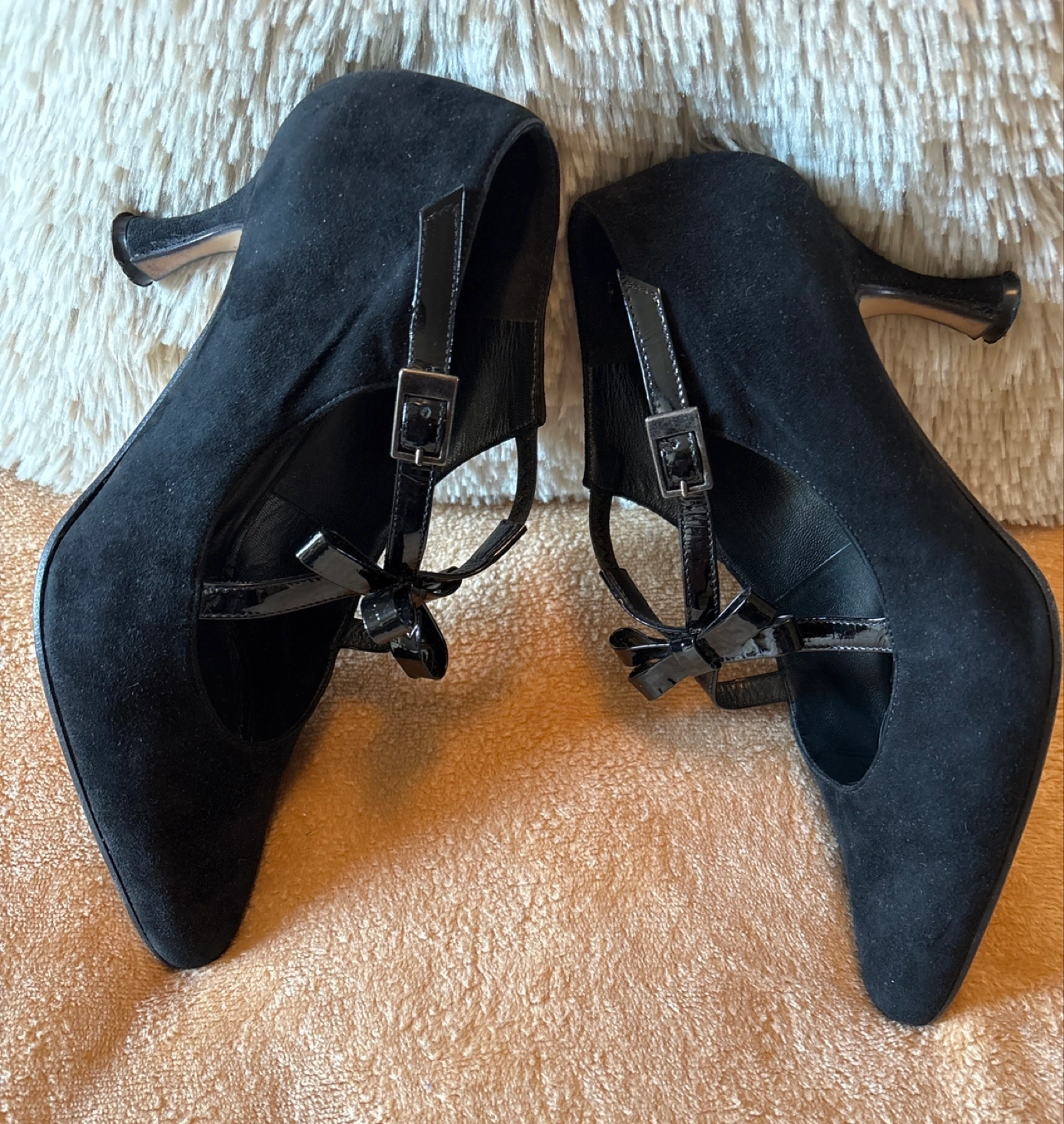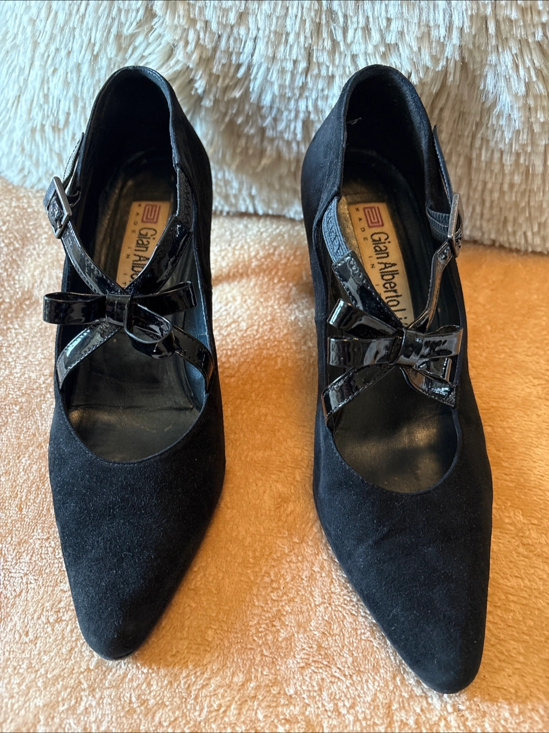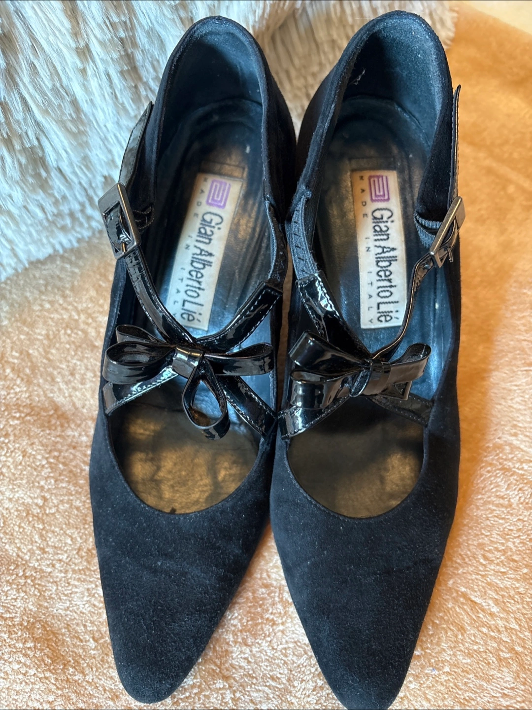 Step out in style with these Gian Alberto Ladies’ black suede heels, a sophisticated addition to any wardrobe. These shoes are a European size 38 and feature a chic patent bow accent. Note that they are in good used condition, ready to add a touch of elegance to your ensemble.