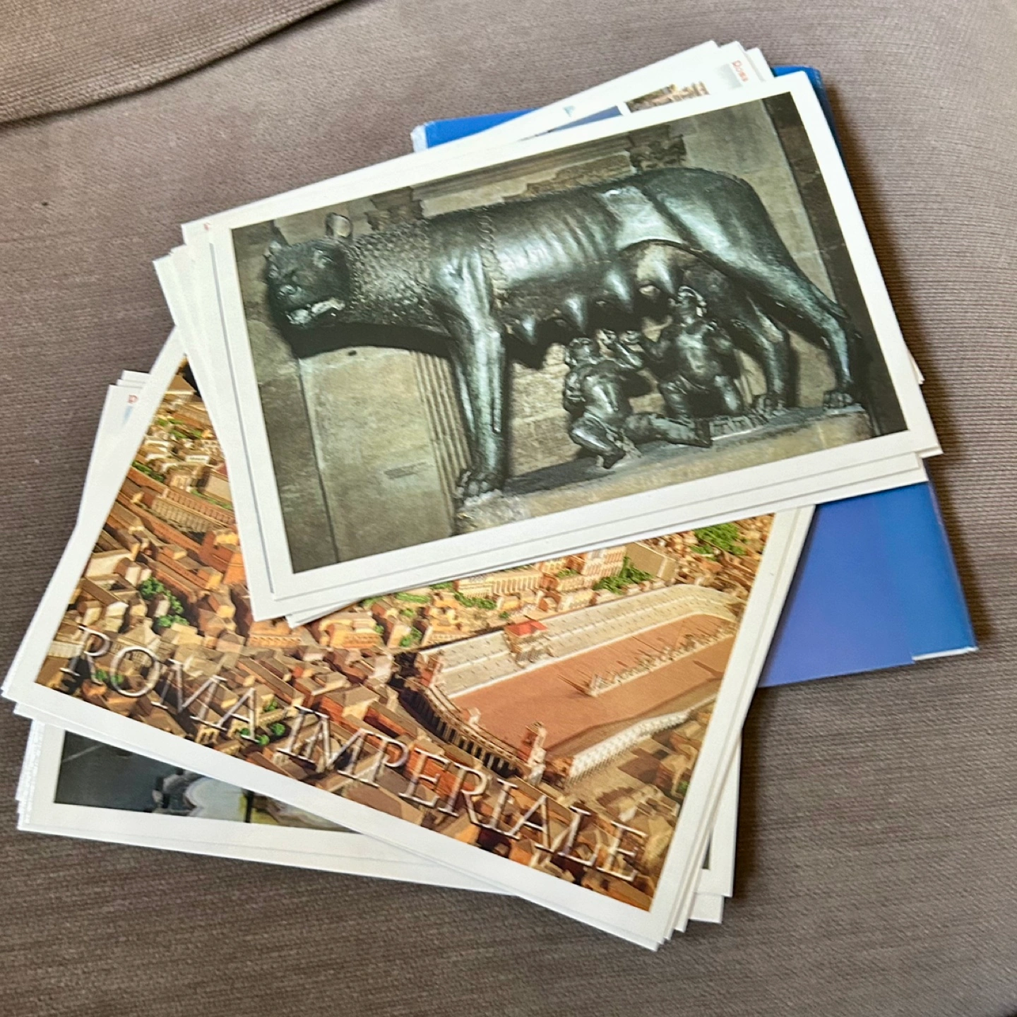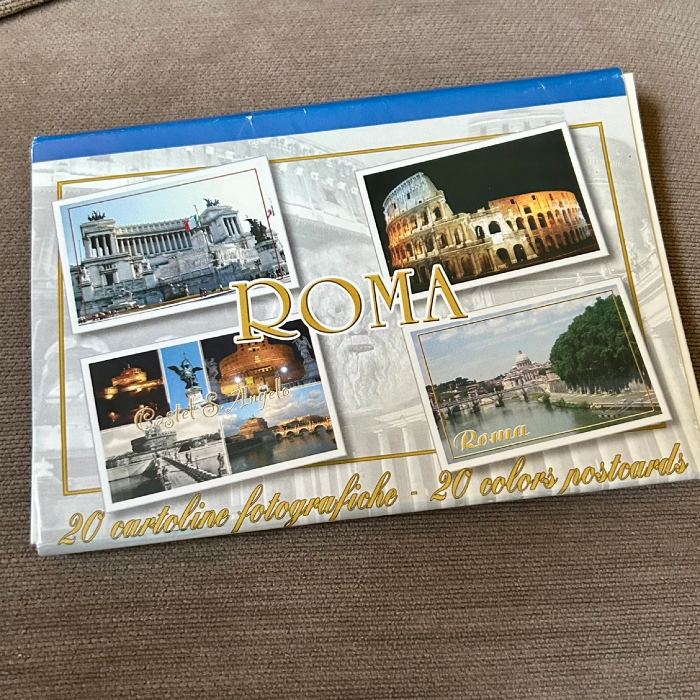 A postcard set from Roma. Showcases several photographs of the city. A perfect item to give yourself a moment to imagine your next vacation. 19 in set. Includes landmarks and the pope.