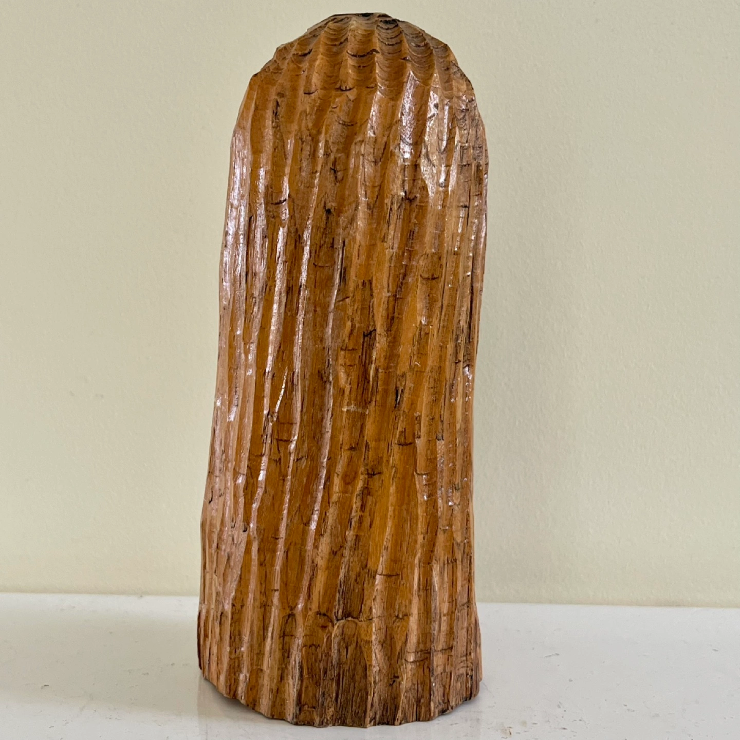 This handcrafted wooden statue features a face with detailed carving. It's a unique piece that adds a rustic charm to any space, showcasing artisanal skill and natural wood grain. 8” tall, 3.5” diameter.