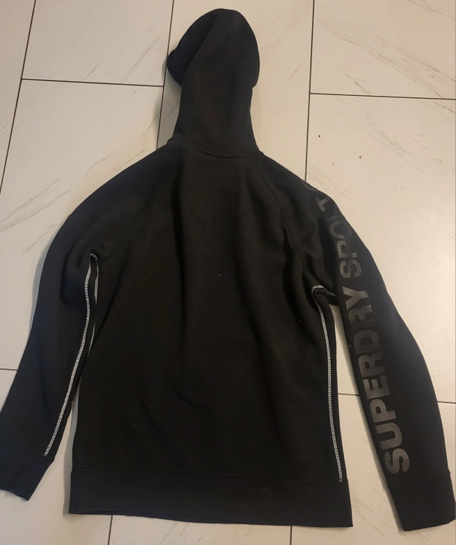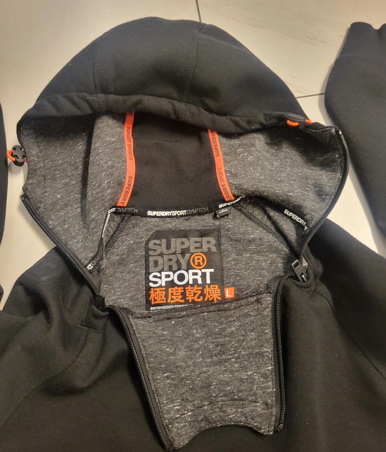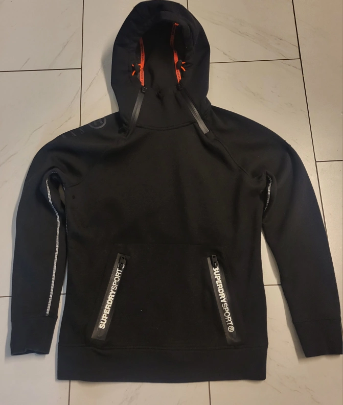 Black hoodie with a front pocket and zippers. Features the Superdry Sport logo. The hood has an orange lining. Finding peace while wearing something like this is a wonderful feeling.L but fits Medium