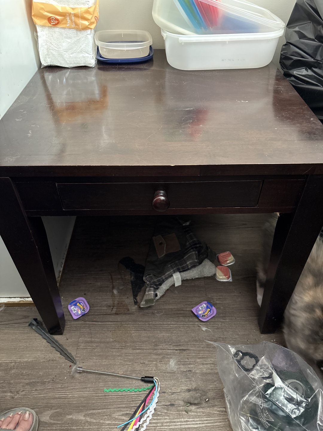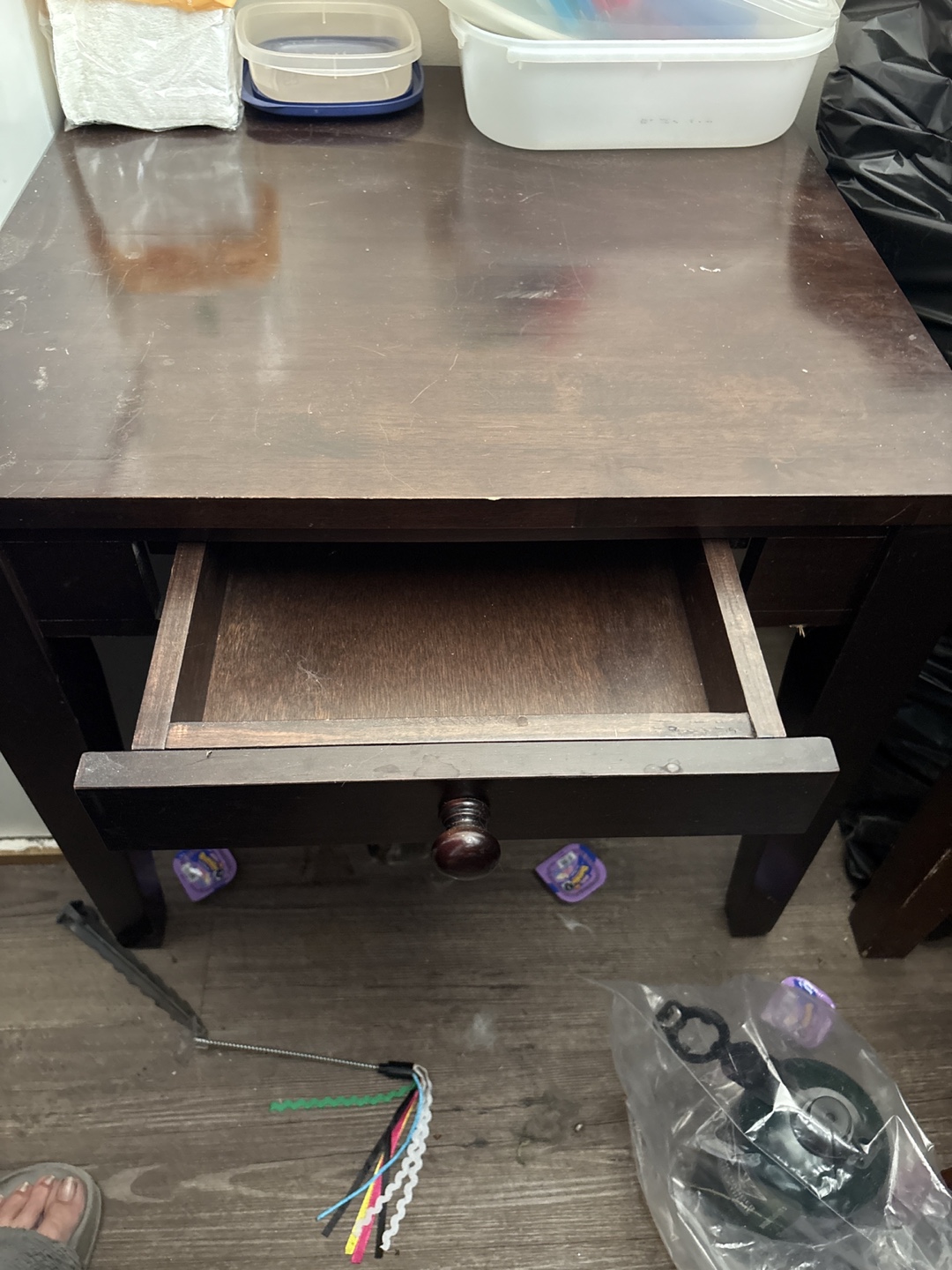 A wooden side table, with a single drawer. Dark brown color. Great for placing by your couch or bed, for easy access to your favourite books and snacks.