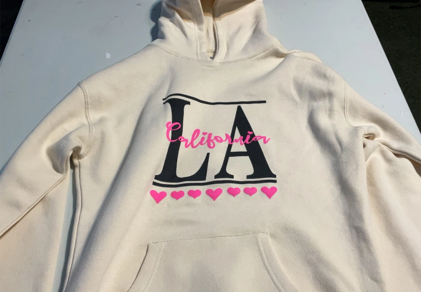 A cream-coloured hoodie. Features a hood, pocket in front. Design on the front that reads "LA California" with pink hearts. It is sure to keep you warm on those cool evenings.