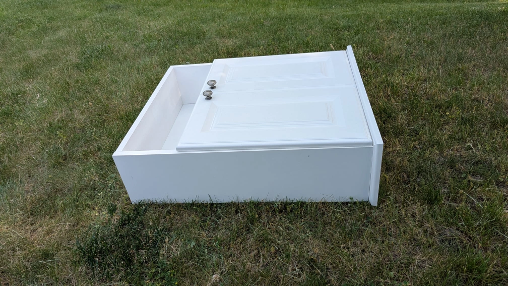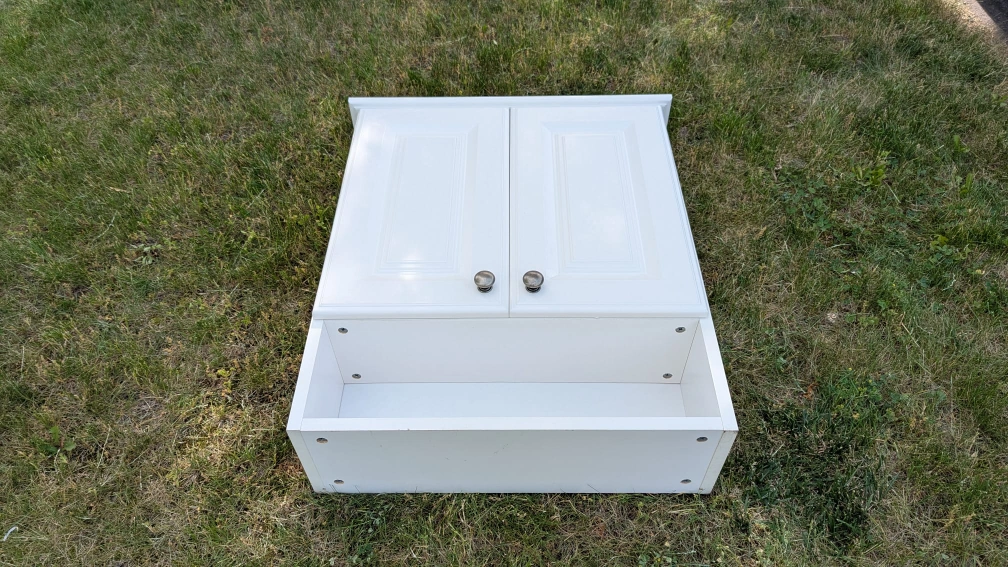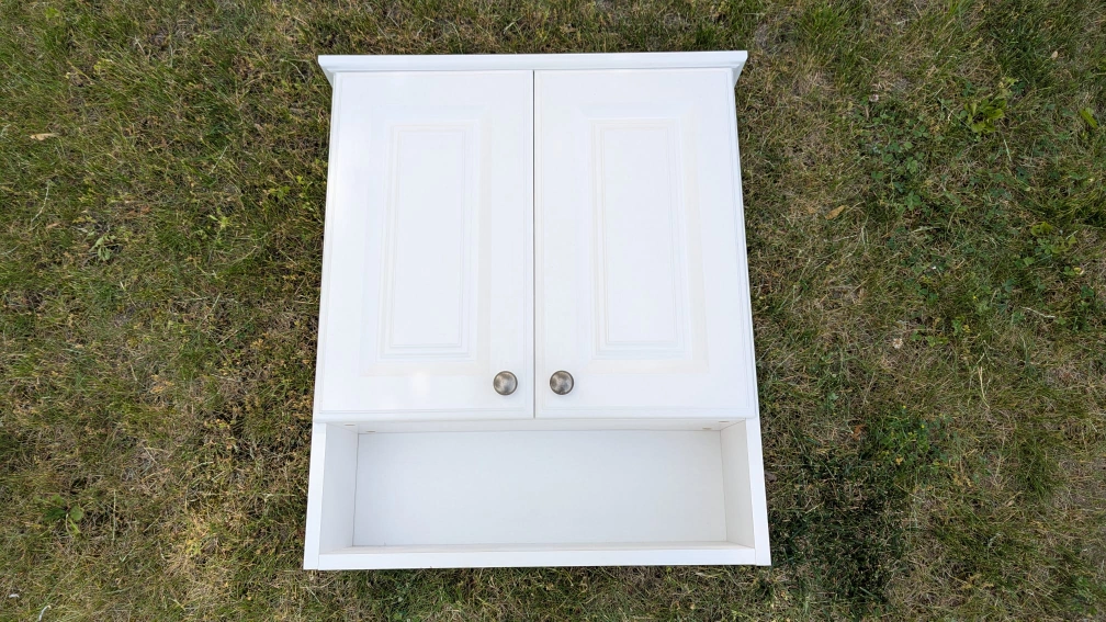 White cabinet. Double doors with knobs. Inside includes shelving. The bottom offers a shelf. Place this in any room for some extra storage, you will find it helpful. for this item, pickup is at shoppers drug mart, 298 John St Thornhill. cash only, price is firm. thank you