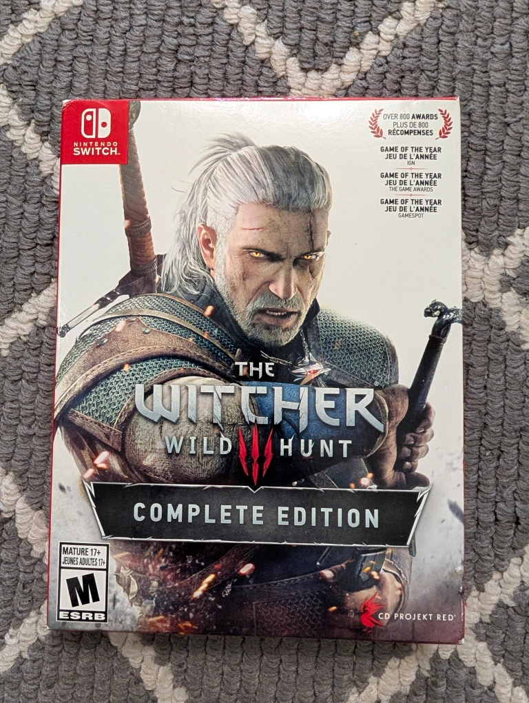 A video game in a case, with an image of a man with white hair. Featuring the words "The Witcher", "Wild Hunt", and "Complete Edition". Perfect for hours of entertainment after a long day.