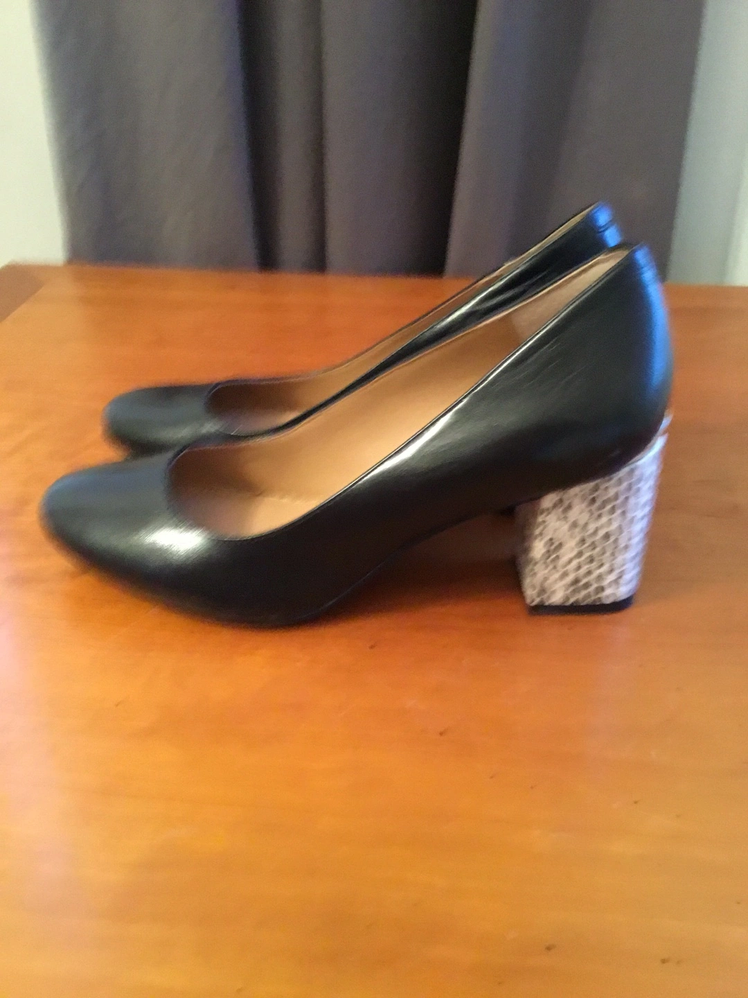 A pair of sleek black heels. Features a stylish patterned heel. Comfortable to wear for any occasion, these heels will keep you looking sharp all day long.