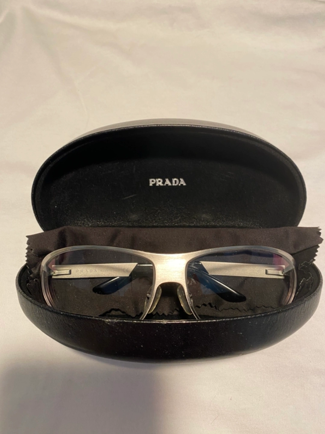 Prada eyeglasses with a sleek silver frame. Comes with a hard shell case and cleaning cloth. The arms feature decorative jewels, which gives a classy look. It has prescription lens . Price for the frame