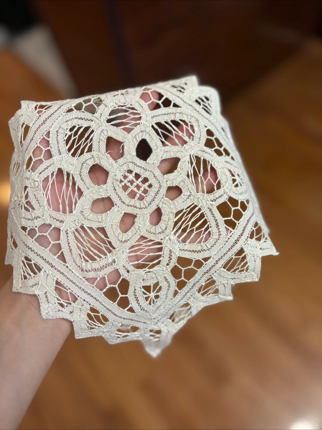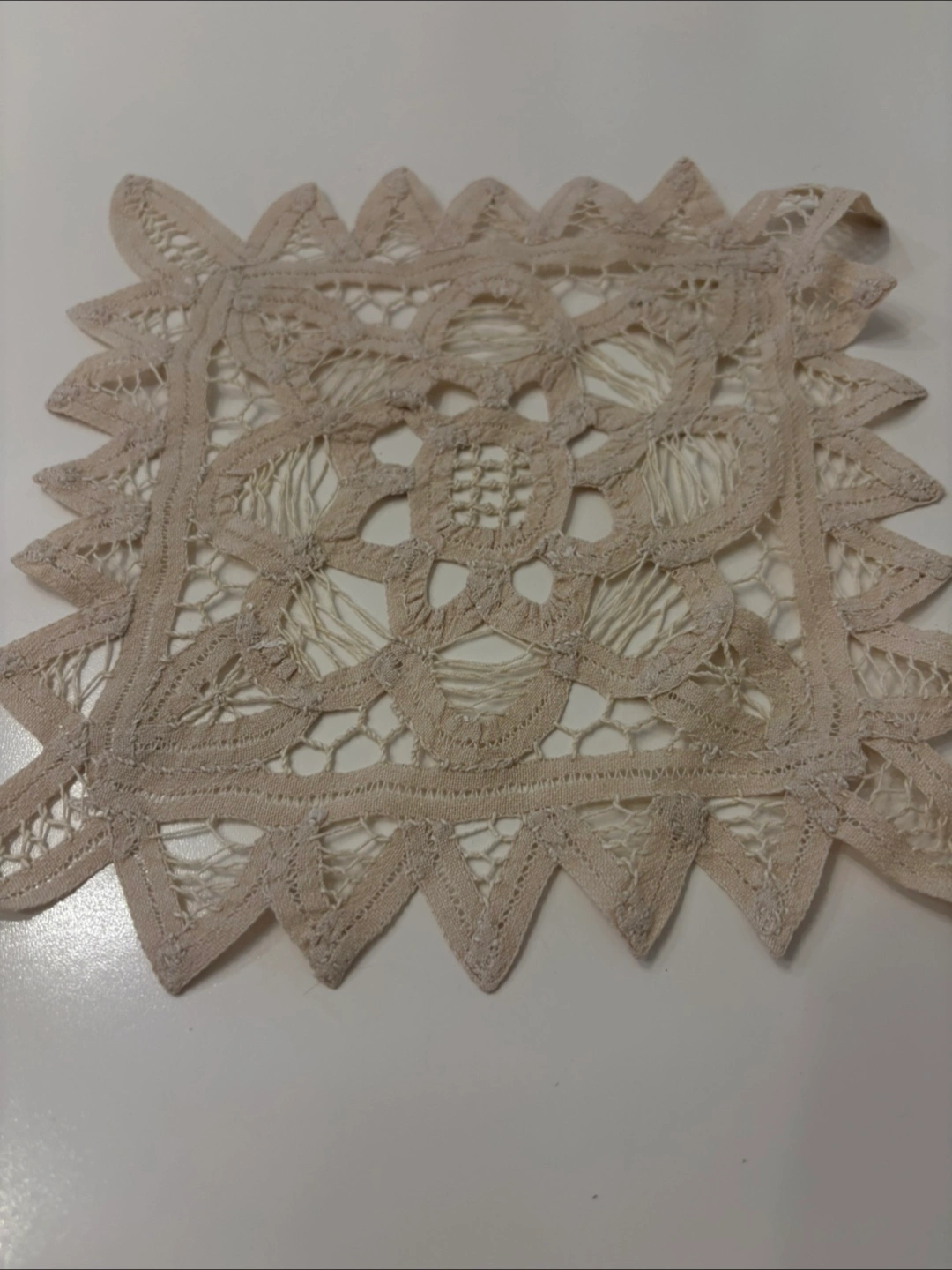 Beige lace doilies. Square-shaped. Decorated with a floral pattern. Bordered by pointed edges. You could use these to decorate any flat surface to make it a little bit more elegant.set of 6