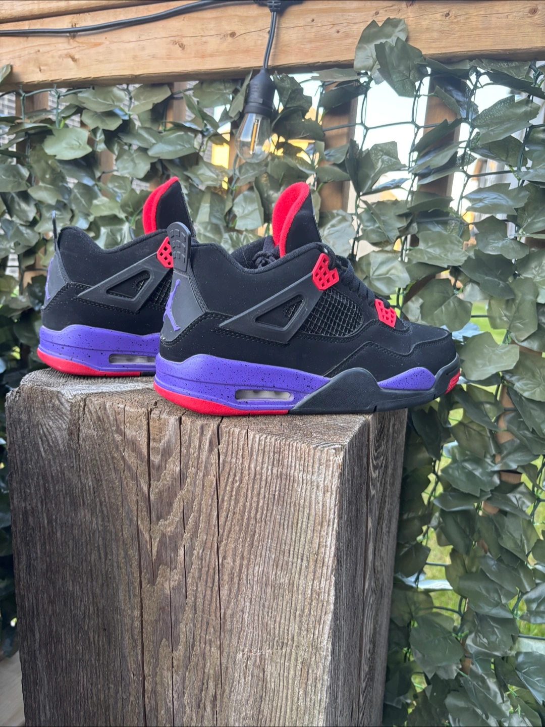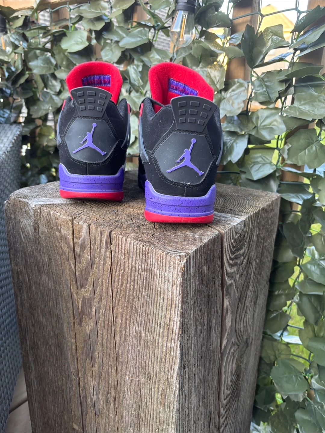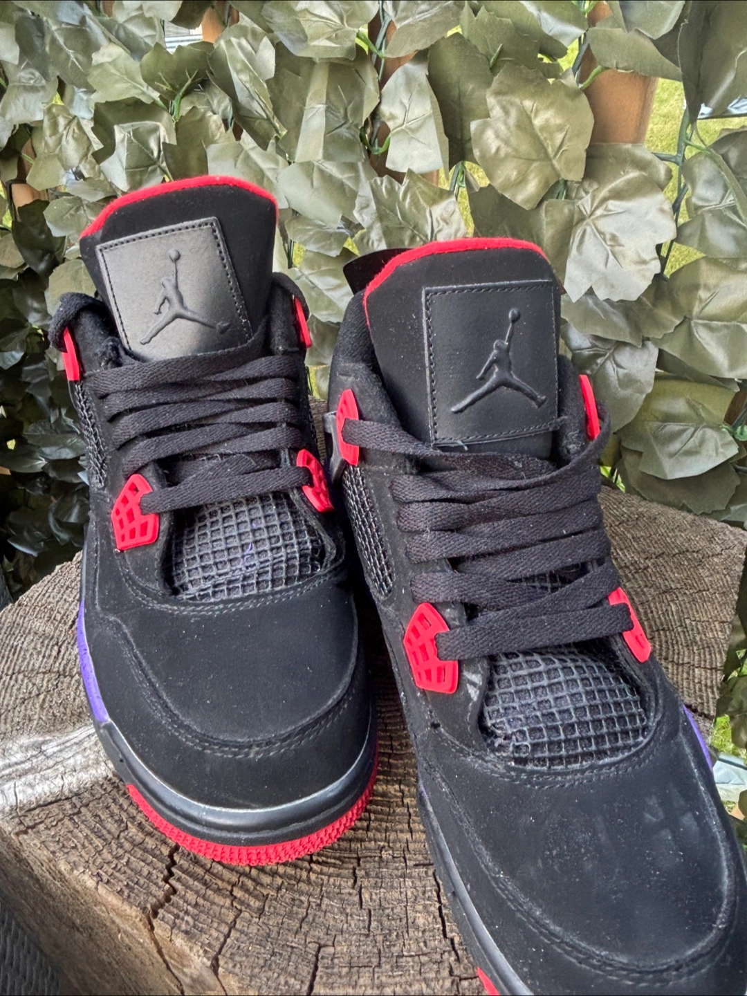 These sneakers are in great condition. They are mostly black. They feature red and purple accents.