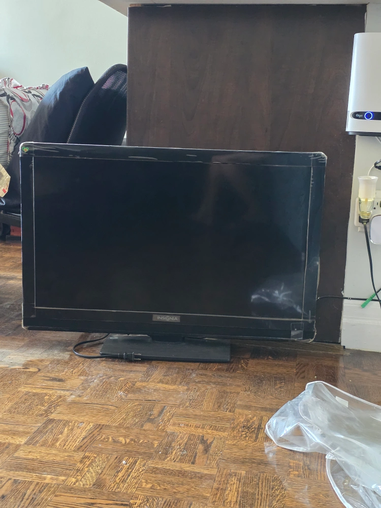 A 32" television with a stand. Black screen and frame. Features a power cord. Perfect for watching movies after a long day. From Pet Free | Smoke Free Home ๐ Wellesley and Sherbourne