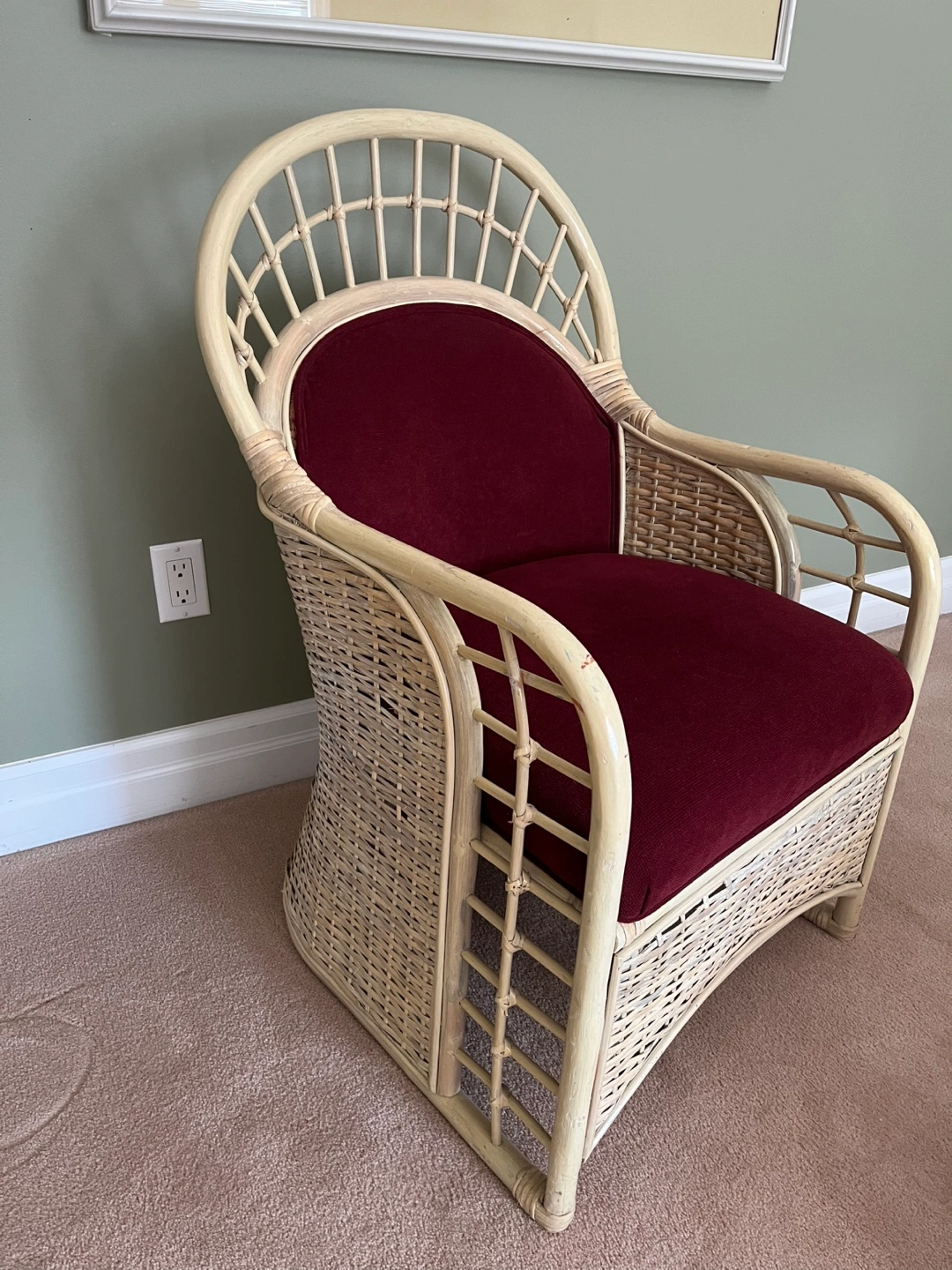 Upholstered Rattan Chair with Burgundy Fabric